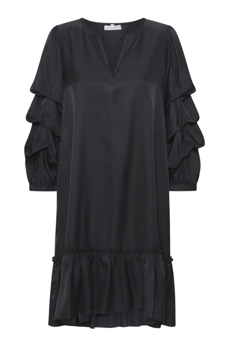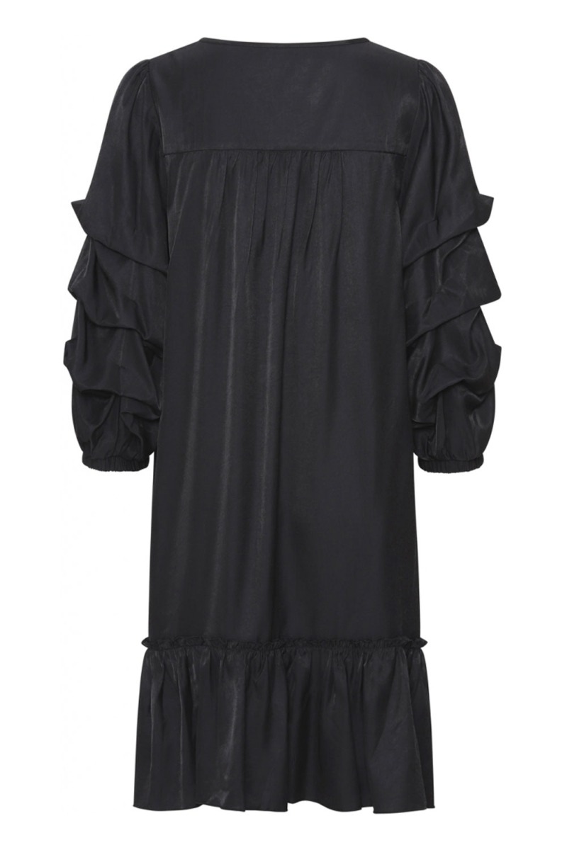 Enkel sort kjole fra Continue i en løs feminin pasform. Kjolen er med v-udskæring og peplum i bunden. De fine ærmer er designet med rynkedetalje og afsluttes med elastikkant. Style denne kjole til festlig anledning.