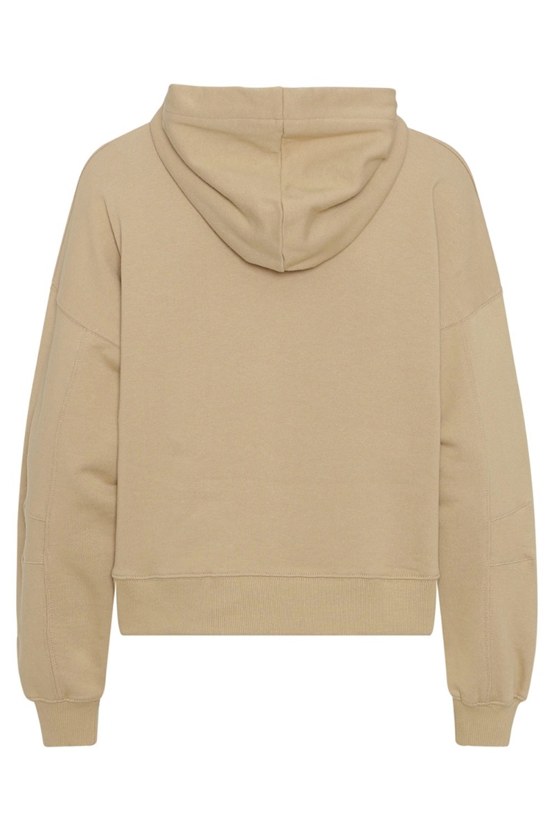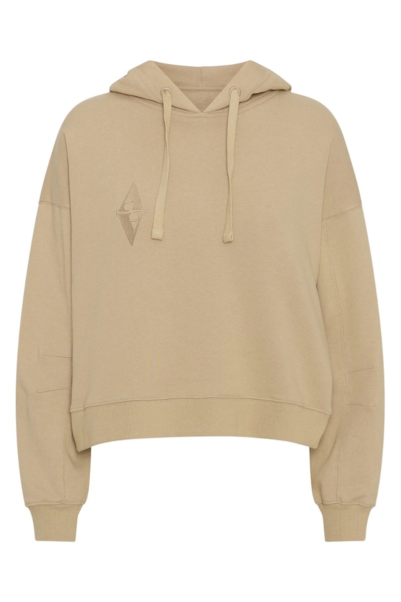 Blød hoodie fra A-View i beige med matchende bukser i samme kvalitet. Sweaten er med hætte og justerbare snører. Foran er den designet med et lille broderet logo på brystet i samme nuance.
