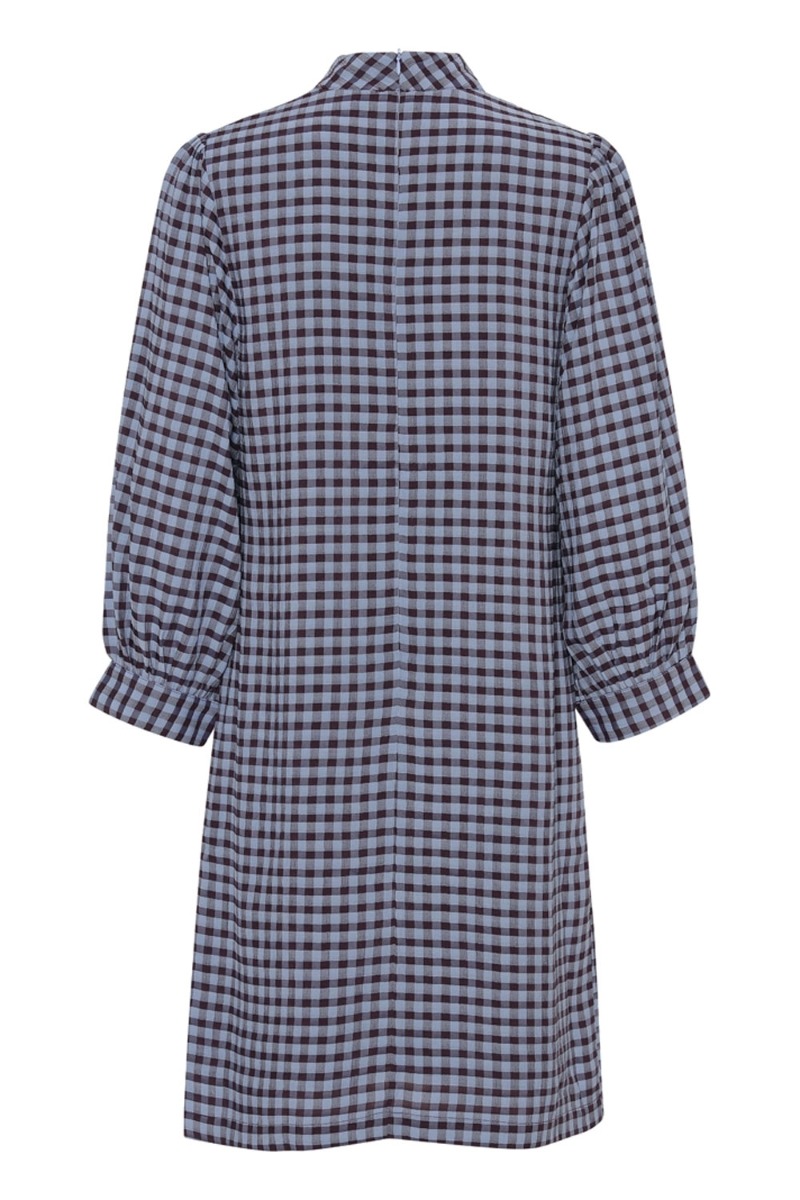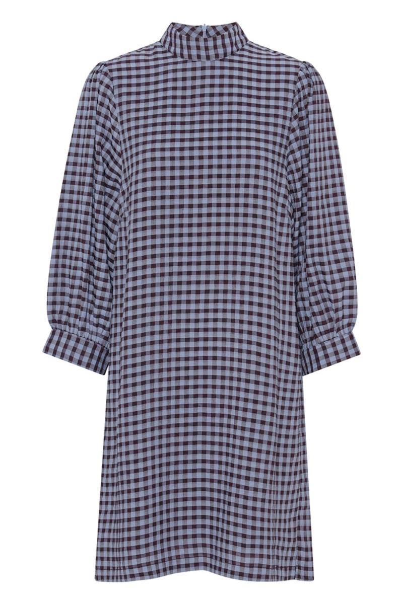 Sød ternet kjole fra A-View. Kjolen er knælang i blå og brune nuancer med pufærmer og høj hals der lukkes i bagpå med lynlås. Den er løst siddende og perfekt både at style til festlig anledning med en stilet og samtidig til hverdag med støvler og en strikvest over.