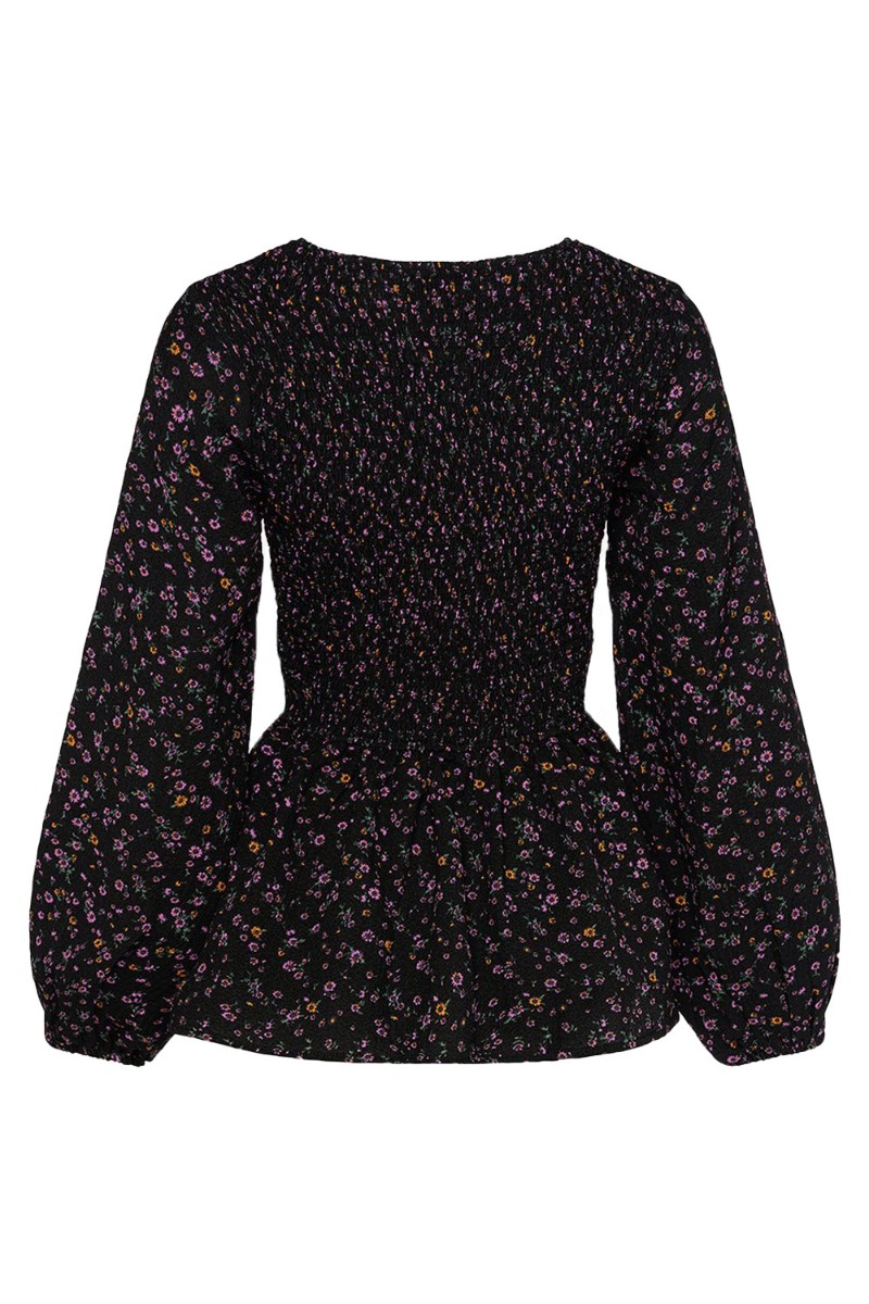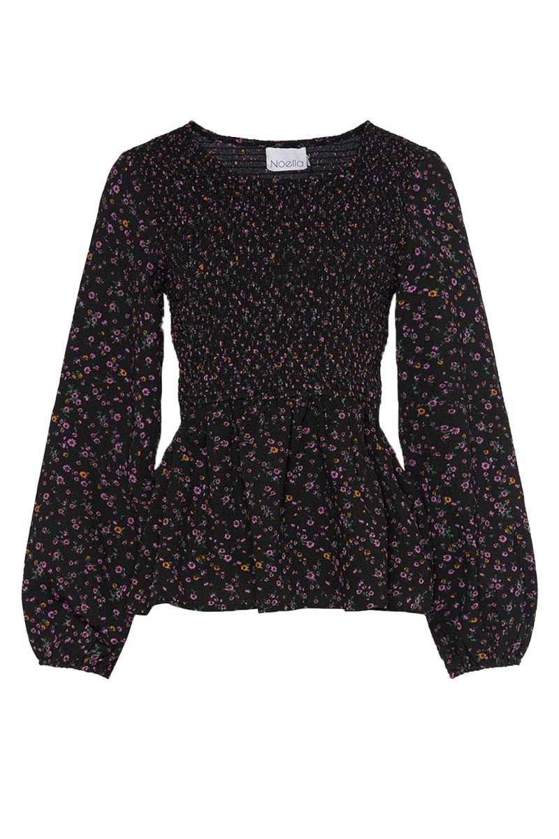 Sød feminin bluse fra Noella i sort med et lille blomsterprint i lilla og orange farver. Blusen er med smock på det øverste stykke og peplum i bunden. Ærmerne afsluttes med elastikkant der giver et lille ballonsnit. Style den til et par sorte bukser.