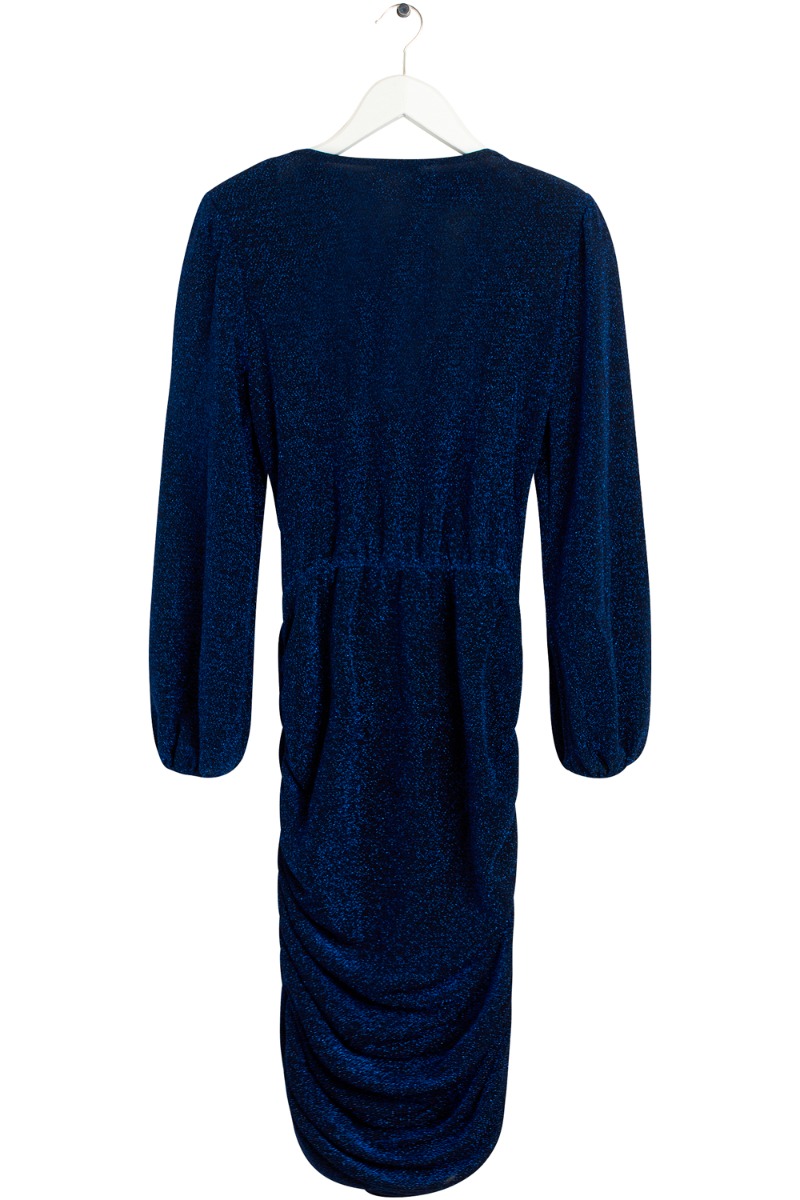 Den flotteste blå glimmerkjole fra BZR kan forudbestilles nu. Kjolen har lange ærmer med en lille balloneffekt, den er skåret i taljen og har foran et lille fald sammen med en slå-om effekt. Kjolens pasform er tætsiddende fra omkring hoften og ned. Der er draperringer i siden der gør man selv kan justere hvor lang kjolen skal være og som giver en virkelig fin pasform. Et snit vi elsker her ved os!