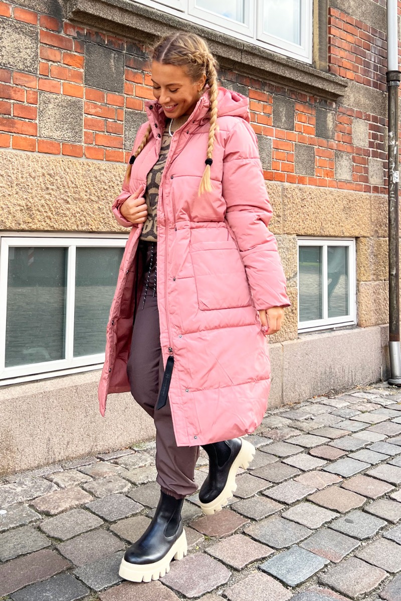 En af de bedste vinterjakker! Basic Apparel har lavet deres velkendte Dagmar Long jacket i denne smukke rosa farve og vi ELSKER den. Jakken har to store lommer forna og lukkes med en skjult lynlås. Jakken er lavet i 100% genanvendeligt materiale og er både vatteret, vindtæt og vandafvisende. En super lækker dynejakke med den helt rigtige pasform og som kan snørres ind i taljen for at skabe mere facon.