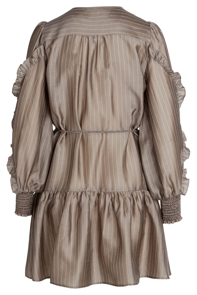 Smukkeste kjole fra Bruuns Bazaar i den smukkeste gråbrune farvenuance med lyse striber. Kjolen har en flot slå-om detalje som giver et super feminimt snit. Foran danner kjolen en flot v-udskæring og har lange ærmer med smockdetalje i bunden. På ærmerne har kjolen også den fineste flæsedetalje som giver et unikt udtryk på kjolen. I bunden af kjolen bliver den afsluttet med en lille pelumeffekt.
