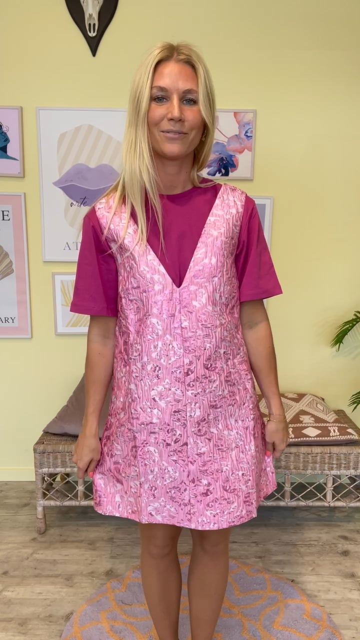 Se lige her, den populære spencerkjole er kommet i en ny smuk farve! Er den ikke bare gudesmuk? Bundfarven er pink med et mørkt pink print over fuld af glimmereffekt, der er gennemgående på hele kjolen. Foran går den ned i en dyb v-udskæring og kan styles over en skjorte eller t-shirt alt efter anledning.