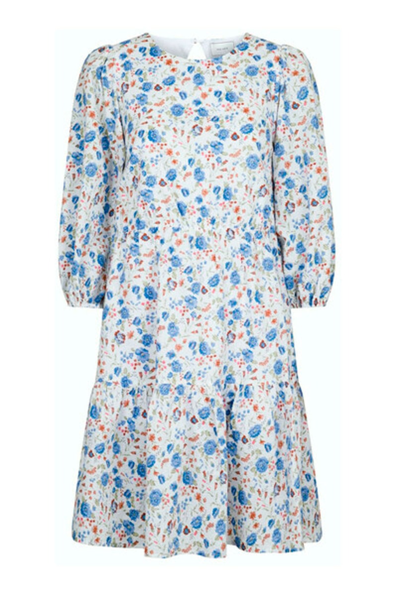Den sødeste blomsterkjole fra Neo Noir. En hvid kjole printet med de fineste blålige og rødlige blomster som giver det fineste sommerlook. Kjolen har en løs pasform med elastikkant under brystet og peplumeffekt i bunden af skørtet. Ærmerne er 3/4 ærmer med balloneffekt. I nakken lukkes kjolen med en enkel softbeklædt knap og den har den fineste smockdetalje på ryggen som giver en smuk pasform.