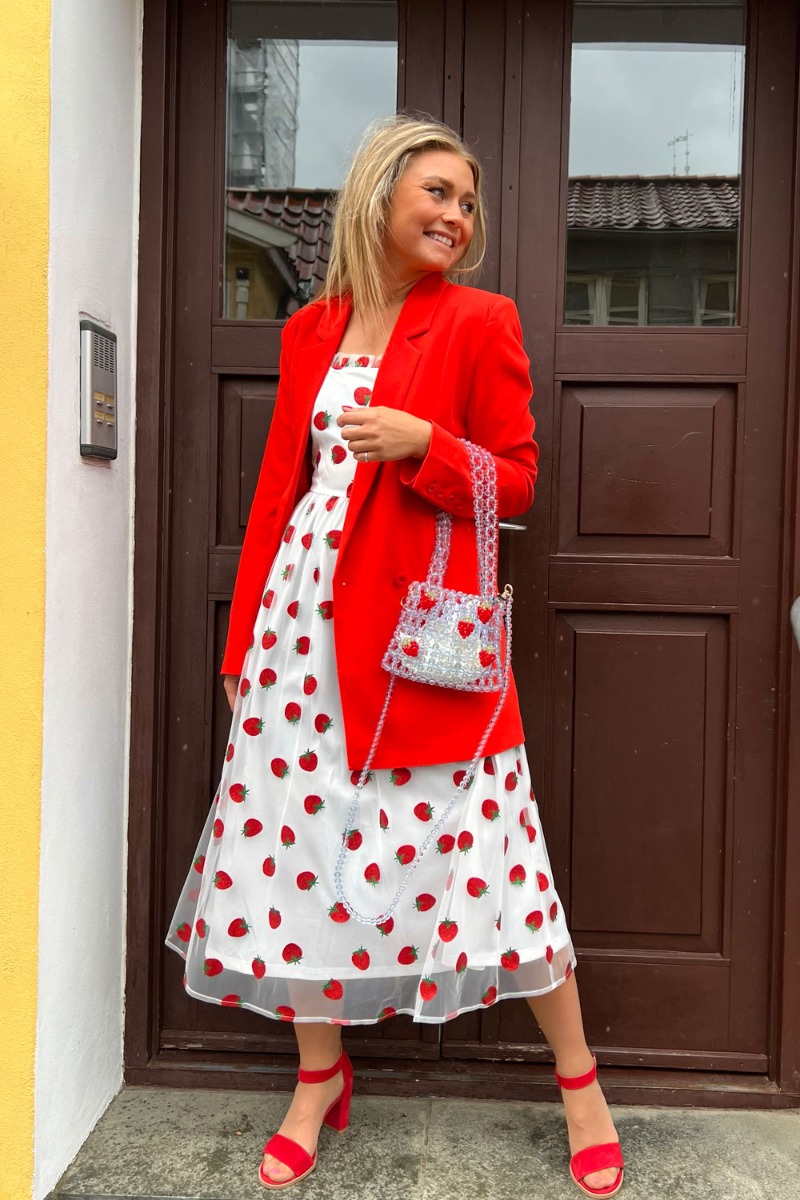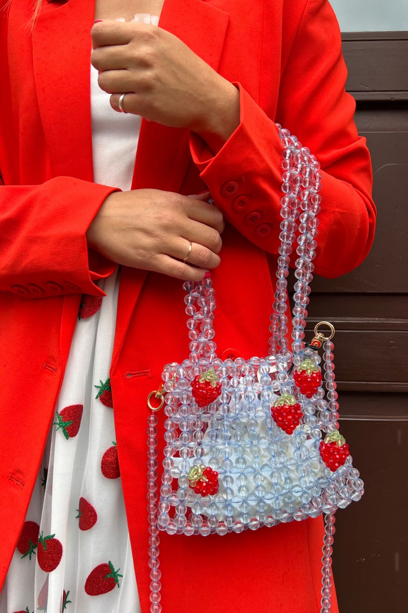 Se lige den smukkeste perletaske fra Noella!!! Tasken er af de fineste lyseblå transparente perler som giver et utrolig smukt og feminint look. Uden på tasken er der syet små perle jordbær på, SIKKE EN FIN DETALJE! Tasken har et stort rum hvor har den har aftagelig lyseblå silkepose hvor alt ens indhold kan være opbevaret i. Tasken her vil sætte det fineste præg på dit næste festlook!