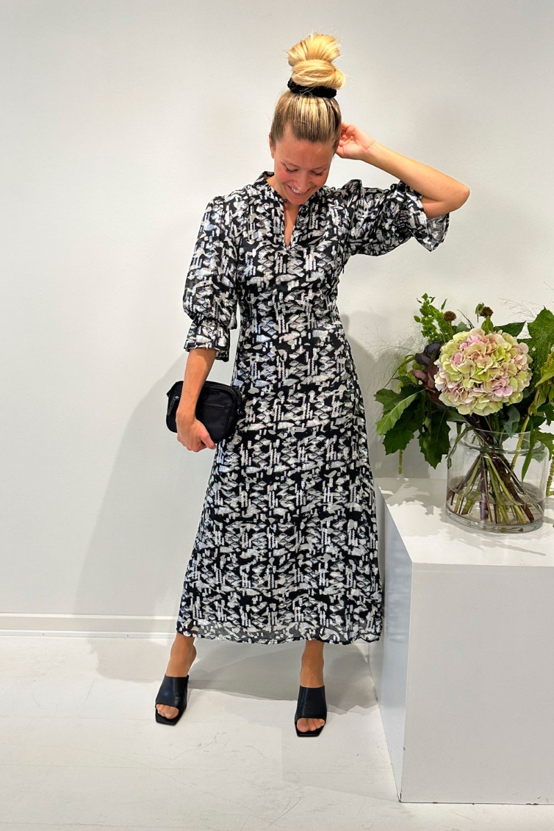 Smukkeste kjole fra Bruuns Bazaar i et langt snit. Kjolen har en sort bundfarve med en sølv tråd som giver en flot metalisk og glimmereffekt. Kjolen har 3/4 ærmer med smock som giver en fin balloneffekt. Den sidder tæt i taljen som giver en feminim detalje på kjolen. Foran har den en v-udskæring som kan lukkes til i toppen med en knappedetalje.