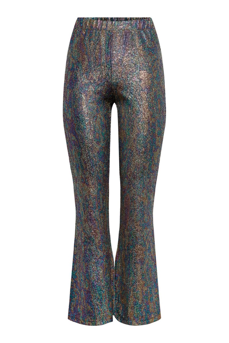 Sejeste diskobukser fra Pieces i en sort bundfarve med multifarvet glimmer effekt. Bukserne har et flared pasform med tætsiddende snit omkring taljen og lår. I taljen har de en elastikkant som gør dem super nemme at få af og på. De har et højtaljede snit og er designet i et utrolig strækbart materiale. For et fuldendt diskolook er det oplagt at style med den matchende wrapbluse.