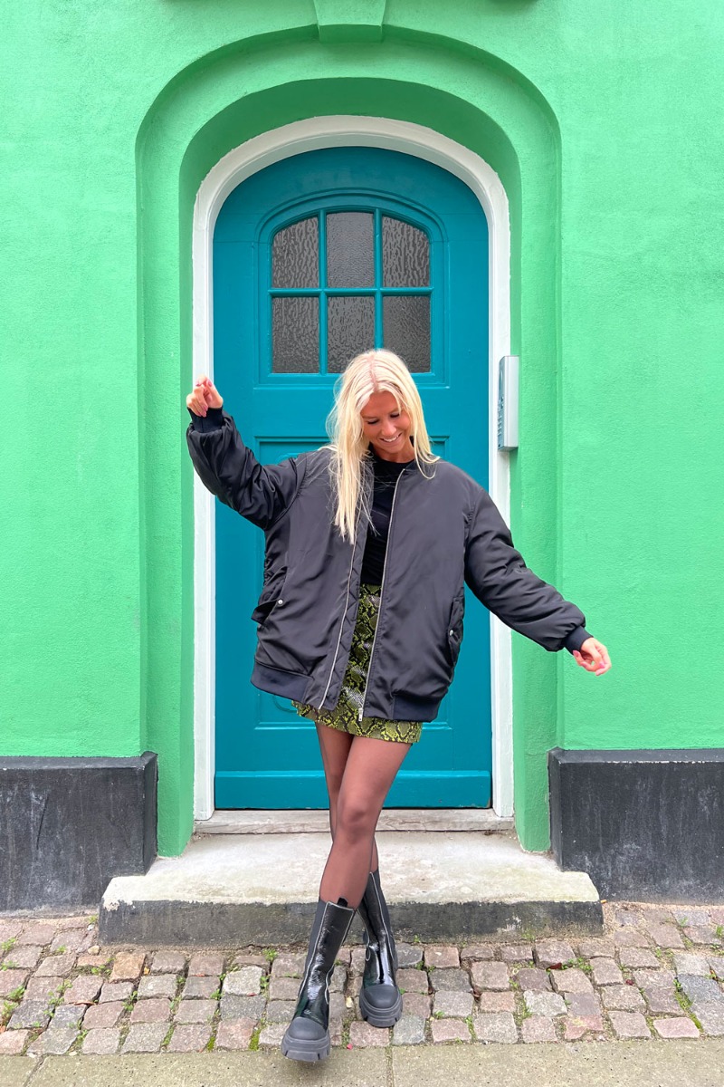 Sejeste bomberjakke fra Pieces i en sort shiny nuance. Jakken har en løs, rummelig og oversized pasform. Den har lange løse ærmer med rynkedetaljer og ribkant ved både ærmekant og halskravekant. Det er i et let og fint materiale og fungere derfor perfekt som overgangsjakke eller som jakke til festlooket.