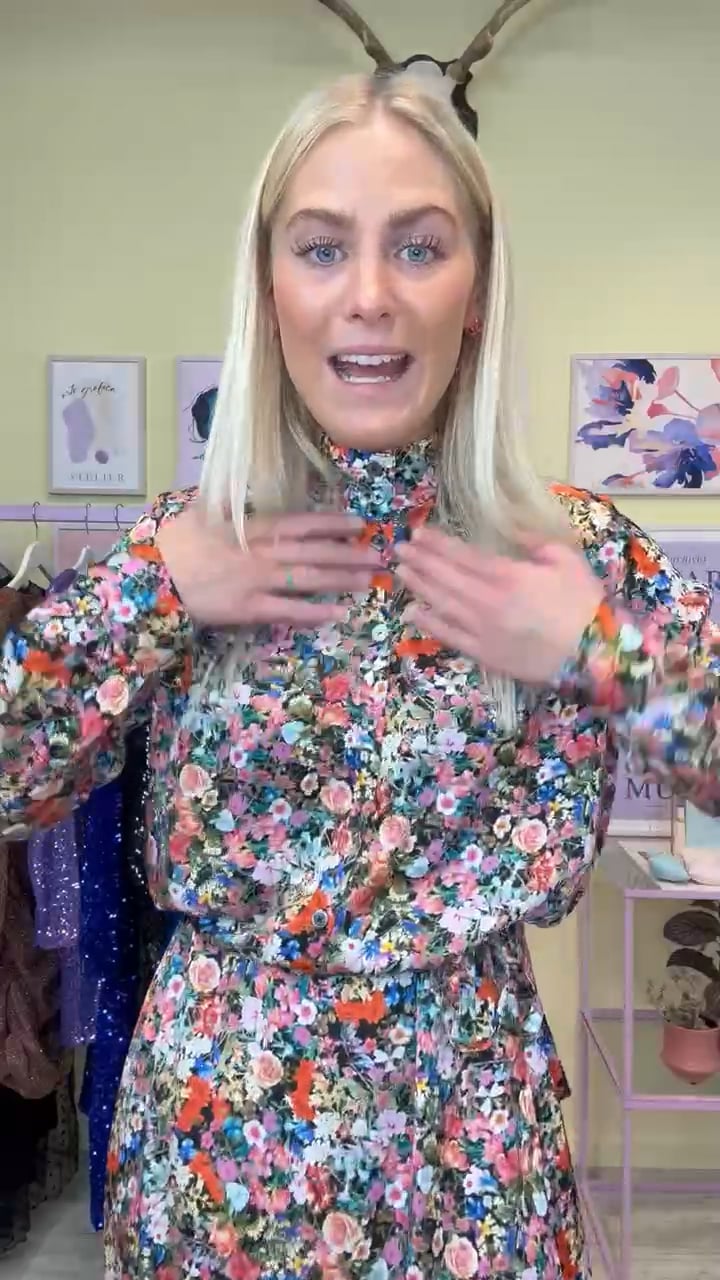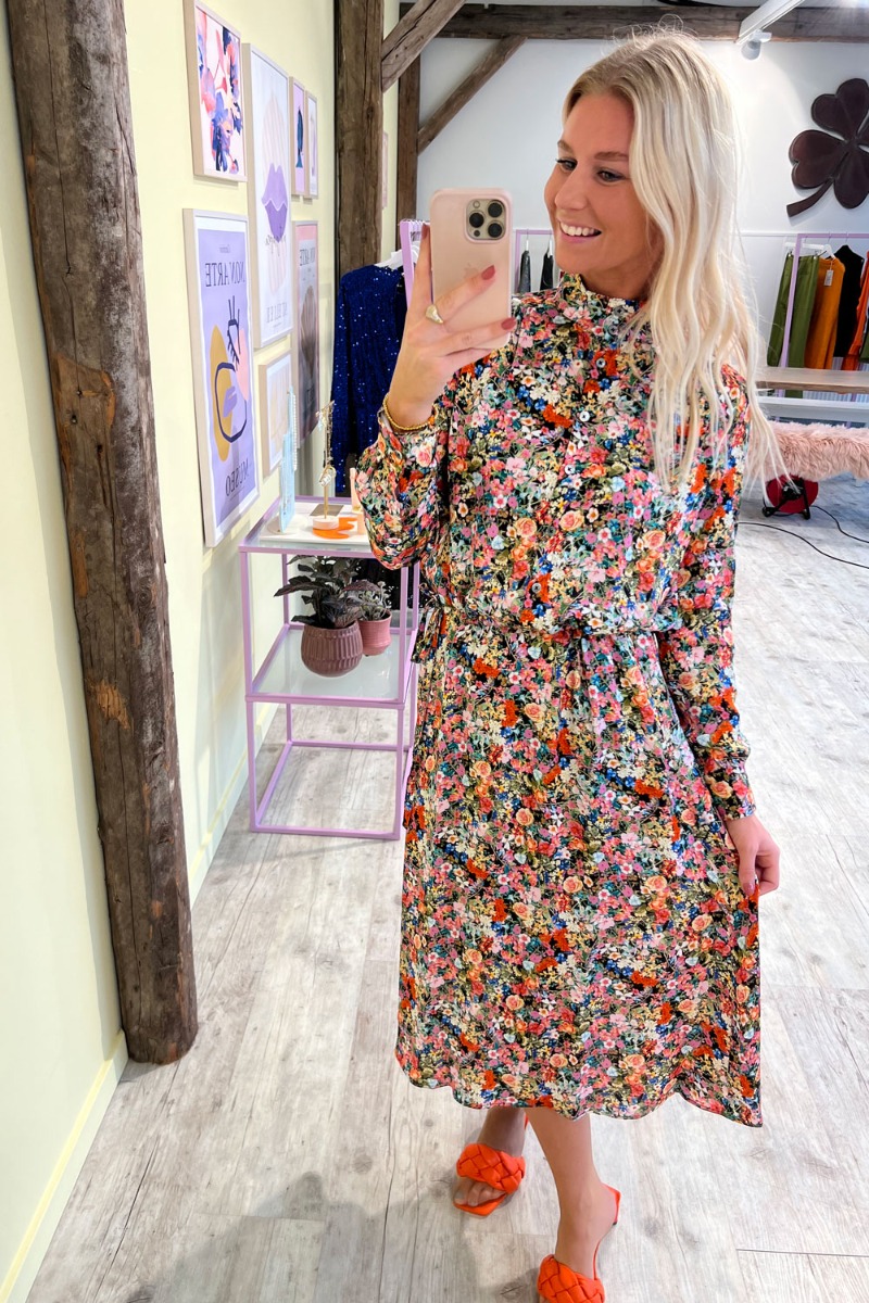 En smuk og feminin kjole fra Dawn x Dare i det fineste blomsterprint med masser af forskellige farver. Kjolen er lavet i et flot skinnende materiale med skjult bindebånd i livet der kan strammes ind i siden. Den knappes foran ned til taljen og har en t-neck der gør den utrolig smuk på.