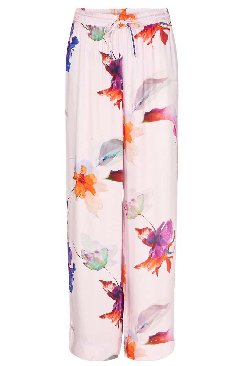 Wauw smukkeste blomsterprint fra Nümph. Et par skønne lyserøde bukser med multifarvet blomsterprint. De har en skøn løs pasform med elastikkant i taljen og snøredetalje i livet. Et par smukke bukser som er oplagt at style til den matchende skjorte.