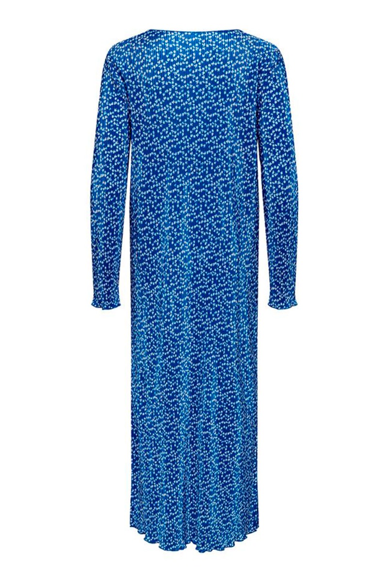 Smuk plisseret kjole fra JDY i koboltblå nuance med hvide blomster. Kjolen har en løs pasform med et midi langt skørt. Den har lange ærmer og rund halsudskæring. I og med at kjolen er plisseret, så er den også strækbar og egner sig fint som en graviditetskjole. Styl den til foråret med en lys sneakers eller en rå støvle.