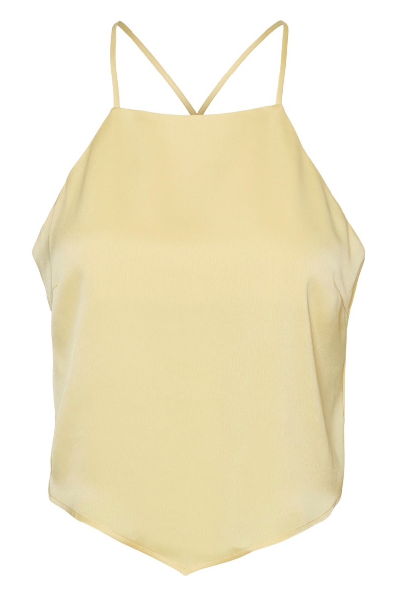 Denne top har et helt enkelt design med tynde stropper og går ned i en spids foran, hvilket giver et cool og anderledes udtryk. Toppen har matchende nederdel i samme shineeffekt og super cool til diverse festivaller såvel til fin fest alt efter skovalg.