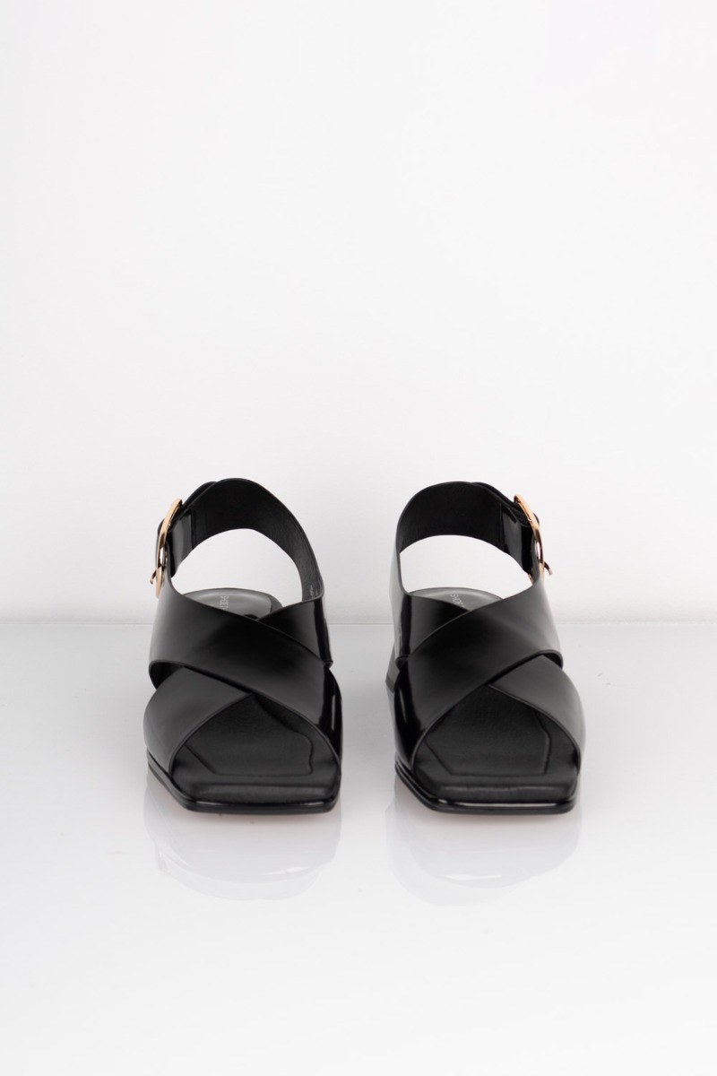 Smuk feminin sort sandal fra Shoe The Bear. Sandalen krydser over vristen og lukkes ved anklen med en justerbarrem og lille guldspænde. Den er helt sort med shineeffekt og hæl på hvilket gør den anvendelig både til fest og hverdag. Den er utrolig behagelig og blød at have på.