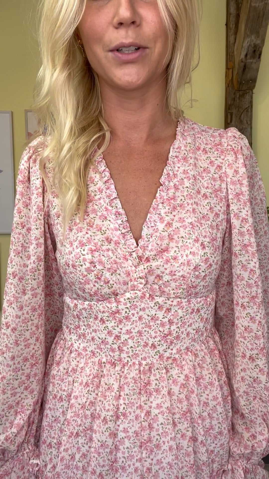 Virkelig SMUK kjole fra Neo Noir med hvid baggrund og det fineste lille lyserøde print med grønne blade. Kjolen har en smuk pasform med tydelig talje og sidder i et løst snit med peplum. Den går ned i v-udskæring foran med flæsedetalje og giver en åben ryg bagtil med smock i bunden. Kjolen har lange ærmer der afsluttes med elastik. Style denne kjole med en rå cowboy støvle eller til en feminin stilet.