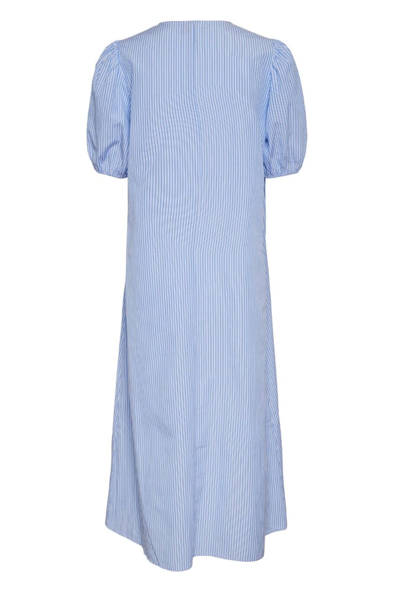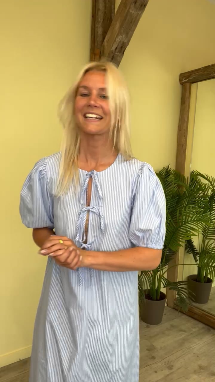 Den smukkeste og nemmeste kjole fra Pieces med striber i hvid og blå. Kjolen er med A snit og har korte pufærmer. Derudover har den fine sløjfe detaljer foran. Der er lavet tre sløjfer som bindes med en tyndt bund. Vi anbefaler af bruge en top eller underkjole under, da den er dyb foran. En let sommer sag!