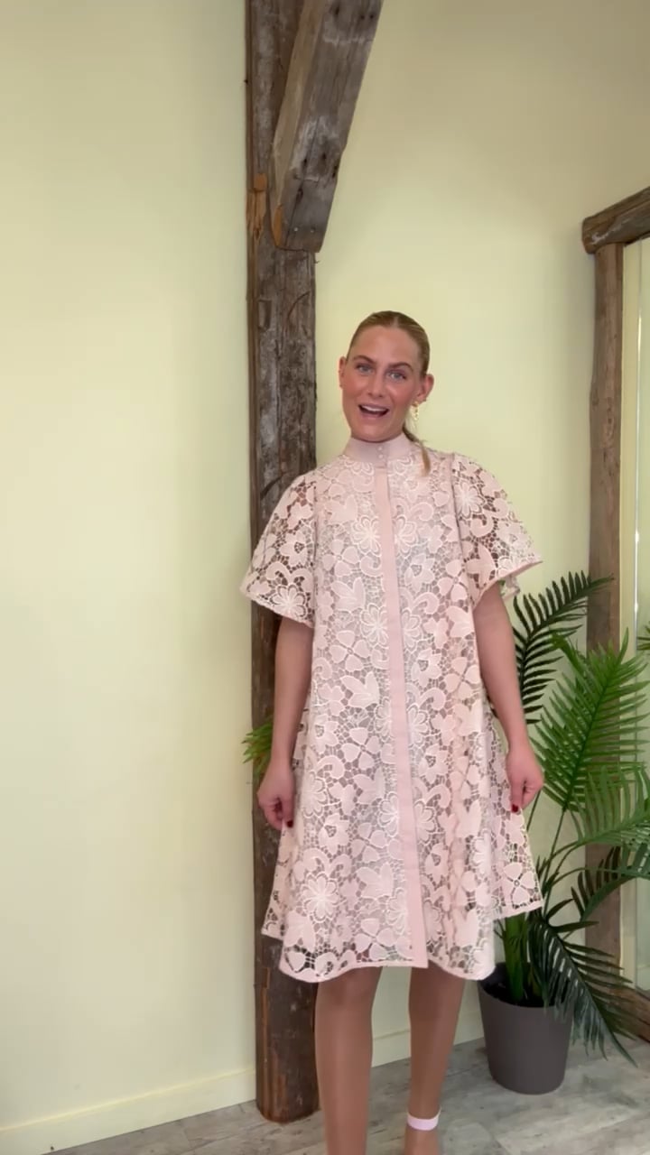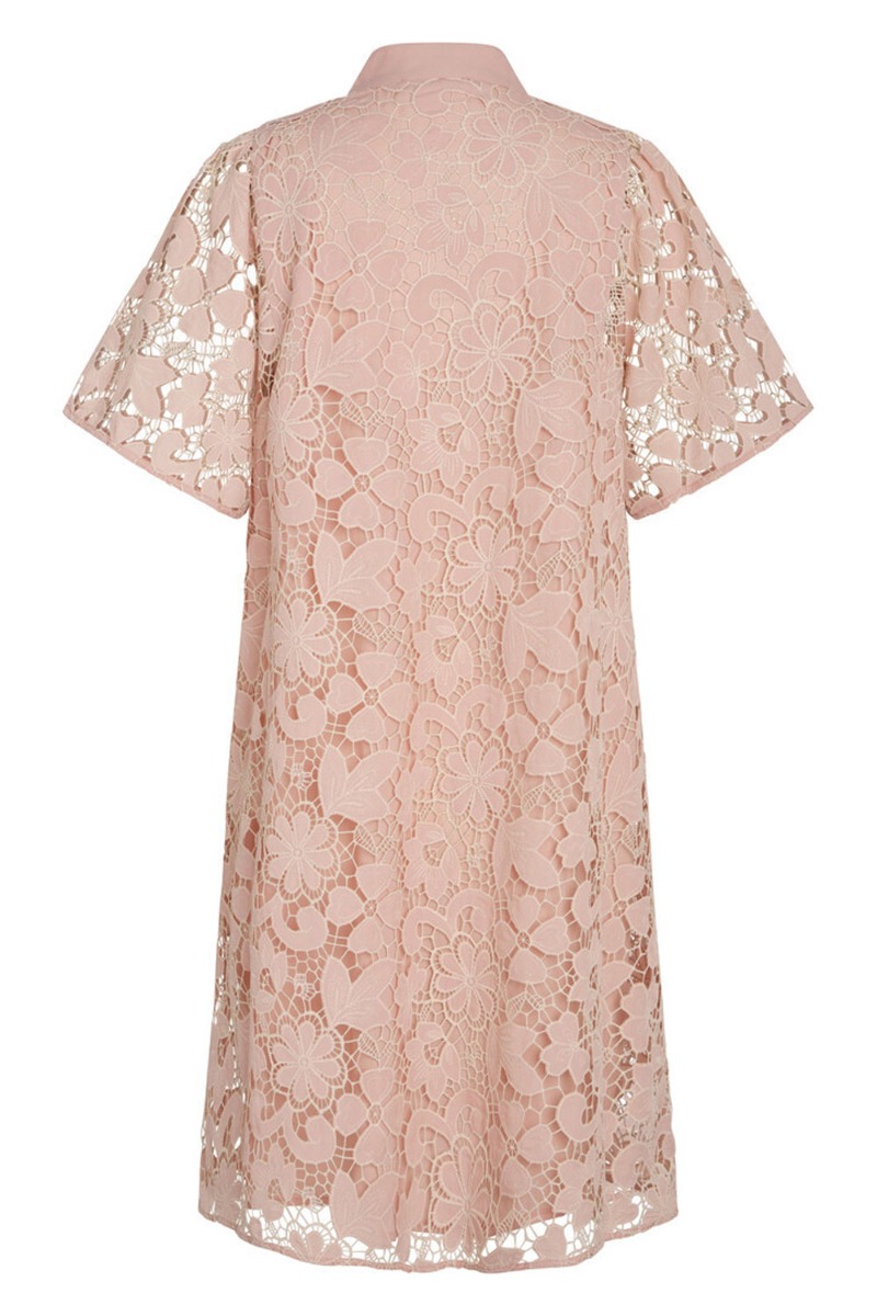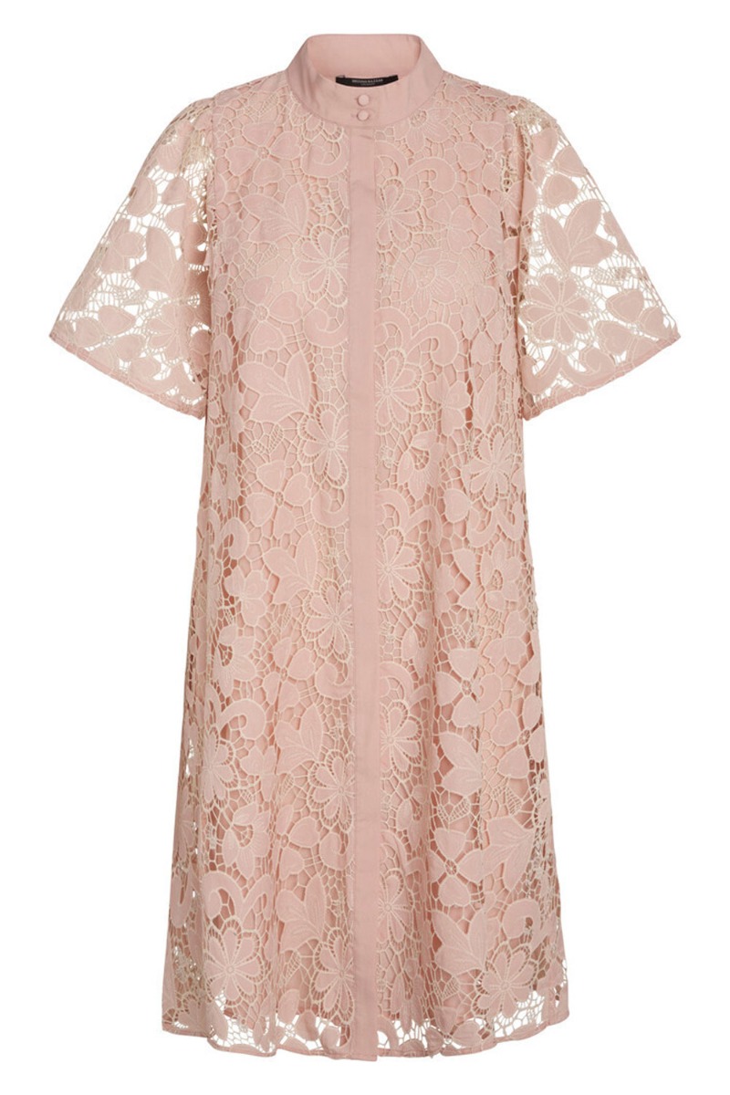 En fin festkjole fra Bruuns Bazaar er kommet i en grov blonde i fersken farve. Kjolen har fastsyet underkjole er knapper foran fra top til bunde. Derfor er den også ammevenlig og den løse pasform kan også fint passer til den tidligere graviditet. Den har korte ærmer som er brede og giver et smukt feminint udtryk til kjolen.