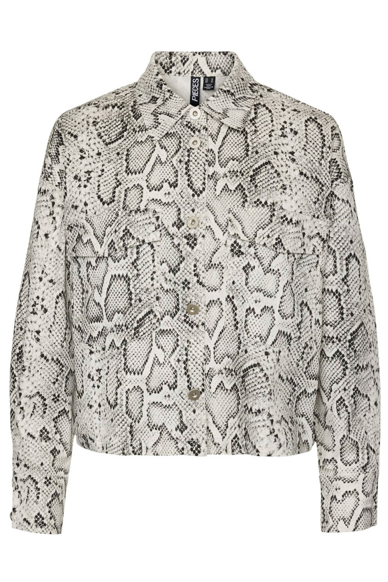 Super sej denimjakke i snakeprint fra Pieces. Jakken har knapper ned foran og der findes en matchende nederdel i samme print.