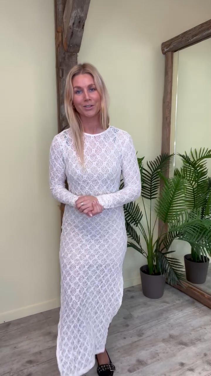 Smuk hvid blondekjole fra Pieces. Kjolen har en tætsiddende pasform og lange ærmer.