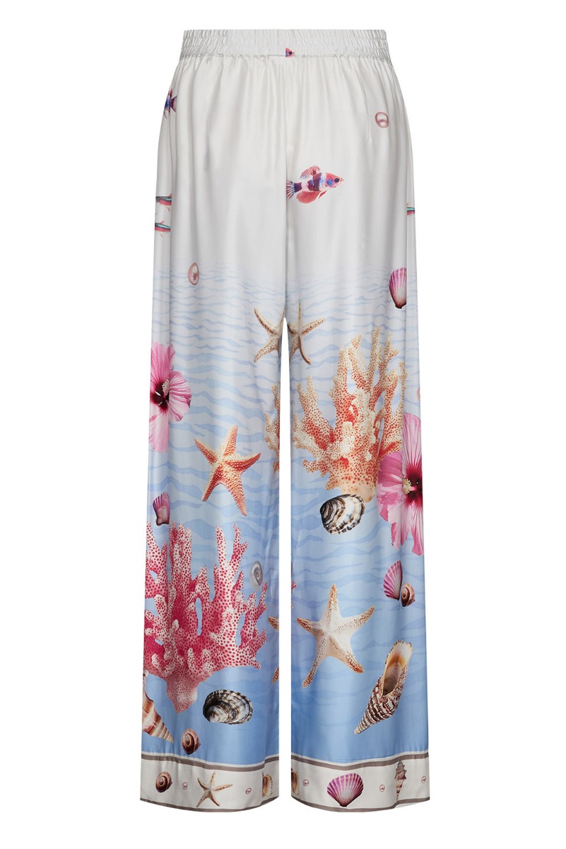 Disse løstsiddende bukser har et let og sommerligt udtryk med et smukt print inspireret af havet. Modellen har brede ben og en behagelig elastik i taljen, som giver en afslappet pasform og gør dem nemme at have på hele dagen. Det lyseblå og hvide design er dekoreret med store blomster, muslingeskaller, små fisk og koraller, der skaber et farverigt og iøjnefaldende look. Bukserne er perfekte til feriestemning og varme dage – style dem med en enkel top eller skjorte for at lade printet være i fokus.