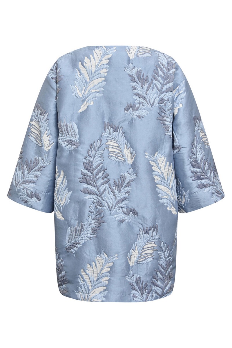 SMUKKESTE blazer fra A-View i blå med et fint bladprint. Blazeren er i en oversize pasform med længde der gør den anvendelig at bruge som en kort kjole alt efter eget ønske. Blazeren lukkes foran med de flotteste similiststen og har løse 3/4 ærmer samt to lommer i siden.