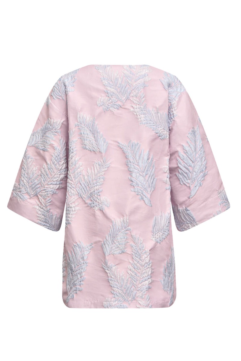 Smuk lyserød blazer fra A-View med blåt blomsterprint. En løstsiddende blazer med brede 3/4 ærmer og similisten som knapper. Den er designet med lommer i begge sider af blazerjakken.