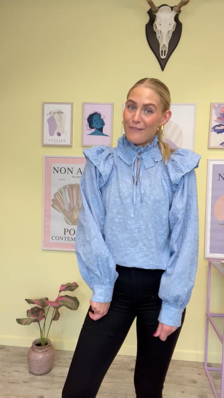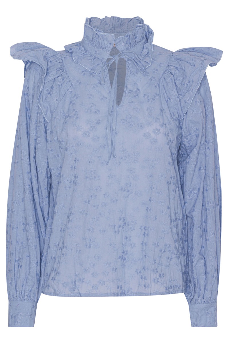Sød blå bluse fra A-View med flæsedetaljer ved skulderen og et fint lille bindebånd ved kraven der giver en sød sløjfedetalje og åbning foran. Blusen har små broderet blomster i samme nuance som blusen og fin at style til hverdag med jeans.