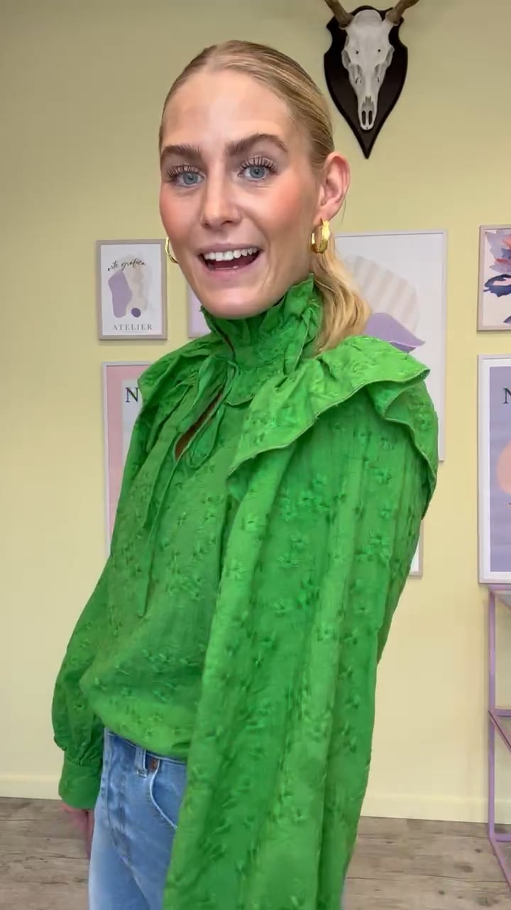 Smukkeste grønne bluse fra A-View med de fineste broderet blomster som har samme farve som blusen. Den er designet med flæser ved skulderen og kraven hvilket skaber et sødt feminint udtryk. Blusen er rummelig med lange ærmer og lukkes med snøre ved halsen. Style med jeans eller en pæn buks.
