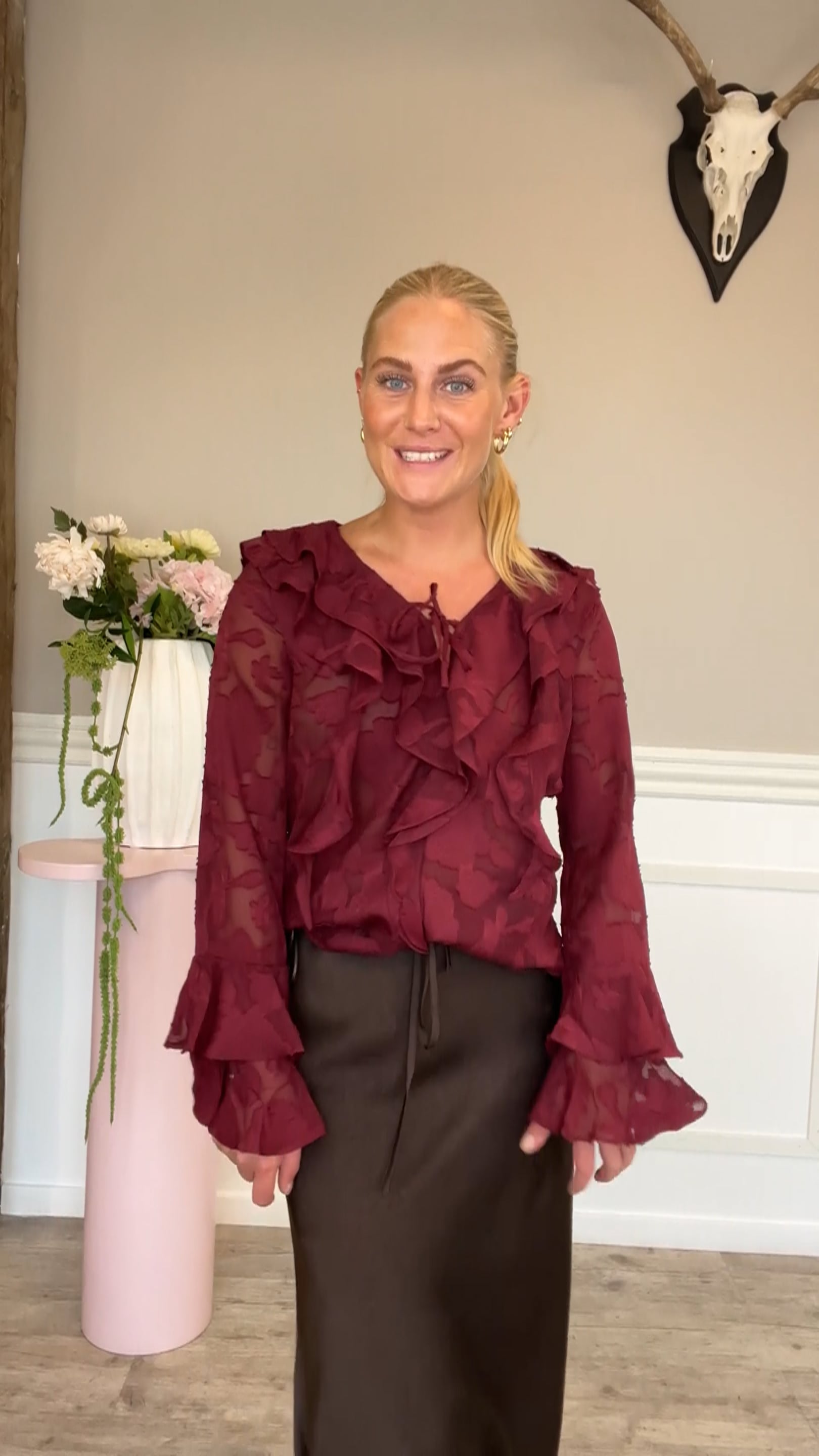 Den absolut smukkeste bluse er netop landet her fra A-View. Denne bluse er i en dyb, mørkerød farve, som er helt oplagt til denne sæson! Den er fyldt med de smukkeste flæser både foran og på ærmerne, som virkelig gør den livlig og festlig at se på!