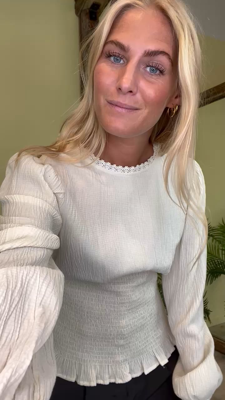 Den fineste bluse fra A-view i en klassisk hvid. Blusen er med smockeffekt, hvilket virkelig giver den et fint udtryk når den kommer på. Der er en lille blonde kant ved halsen og blusen lukkes med en knaplukning i nakken. Derudover er der elastik i ærmerne som giver den et fint ballonlook.