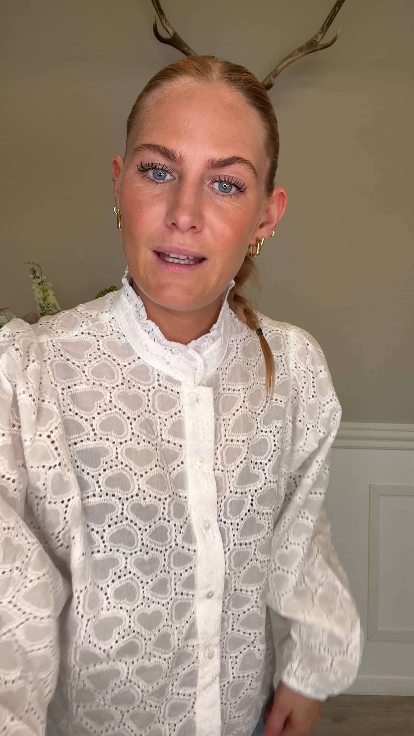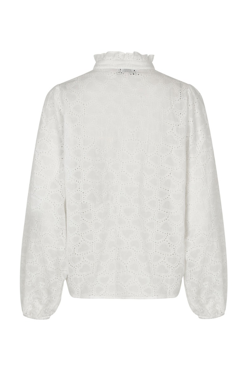 Super sød bluse fra A-View! Denne bluse har et feminint design med hjertemønster. Blusen har flæser ved kraven og knaplukning foran. Ved ærmerne har den elastik, som giver en fin effekt.