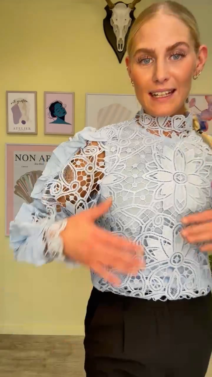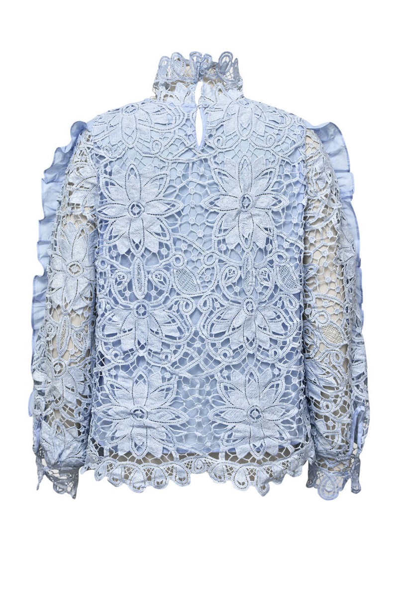 Smuk lyseblå blonde bluse fra A-View. Blusen har en løs pasform med løse ærmer som har flæsedetaljer og en høj hals med blonder. Den er foret med en underbluse, så den ikke bliver gennemsigtig. Styl den til forårets fester med et par jeans eller en fin nederdel.