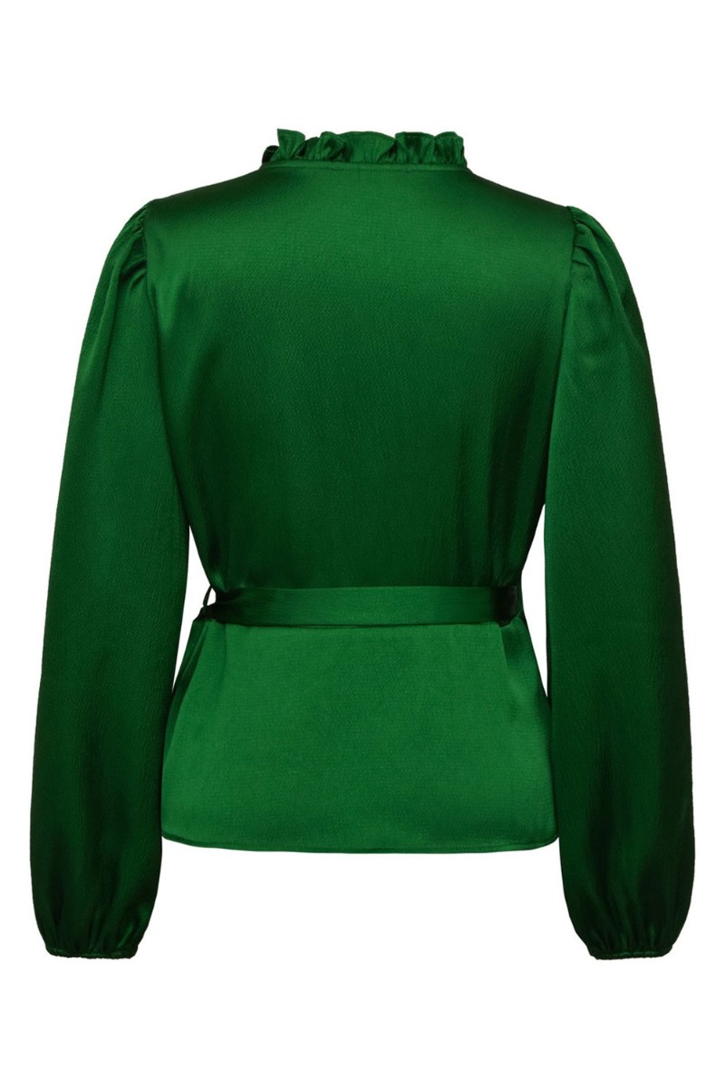 Feminin bluse fra A-View i en flot grøn nuance med shineeffekt. Blusen er med slå-om der bindes i siden og har en fin lille flæsedetalje langs kanten. De lange ærmer afsluttes med elastikkant der giver et løst snit. Style med bukser eller en nederdel.