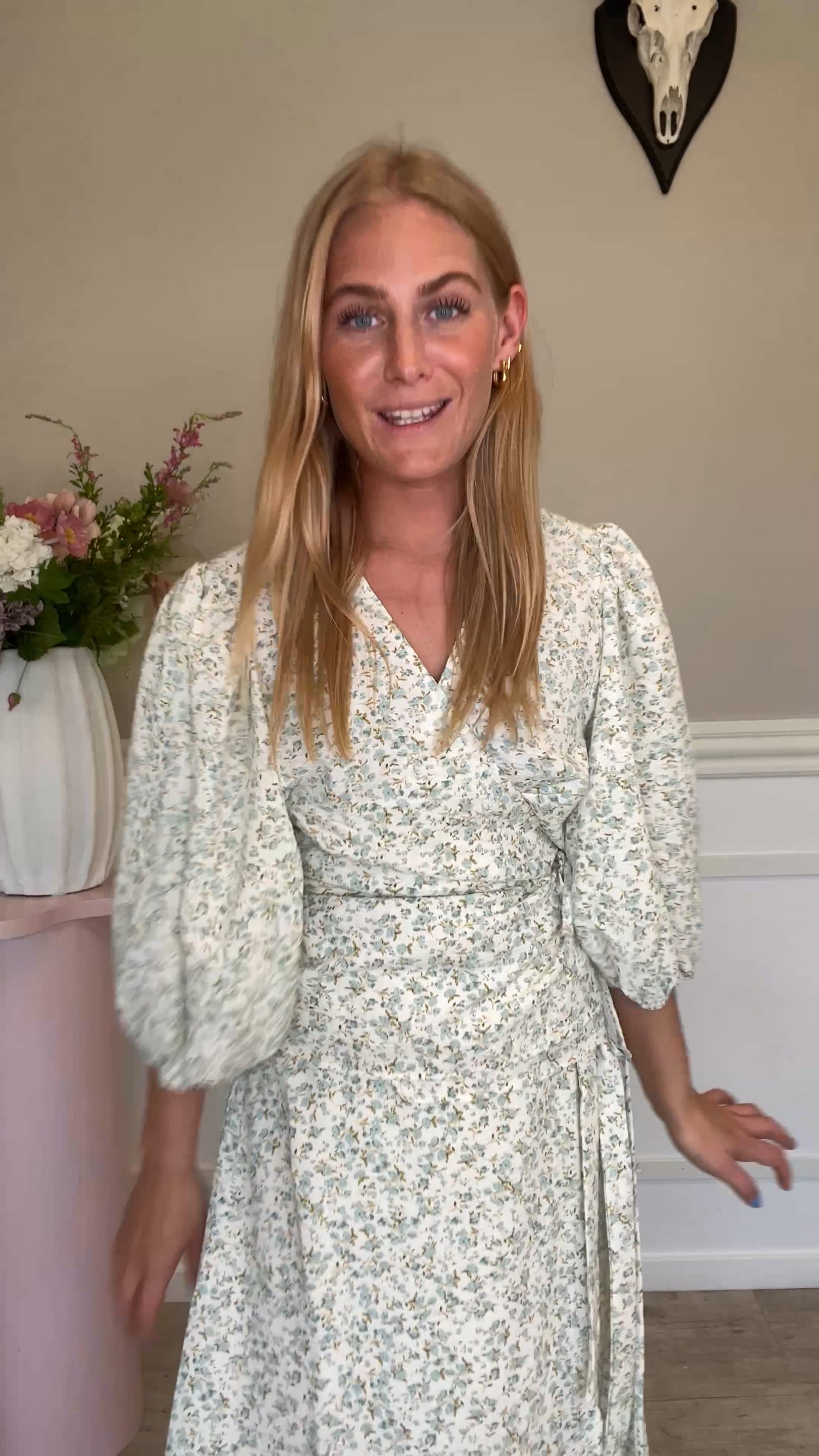 En wrap bluse fra A-View. Denne bluse har korte ærmer, v-udskæring og bindebånd. Den har en lys baggrundsfarve med print af blomster i blå farvenuancer. Virkelig fin at style til et par shorts eller nederdel.