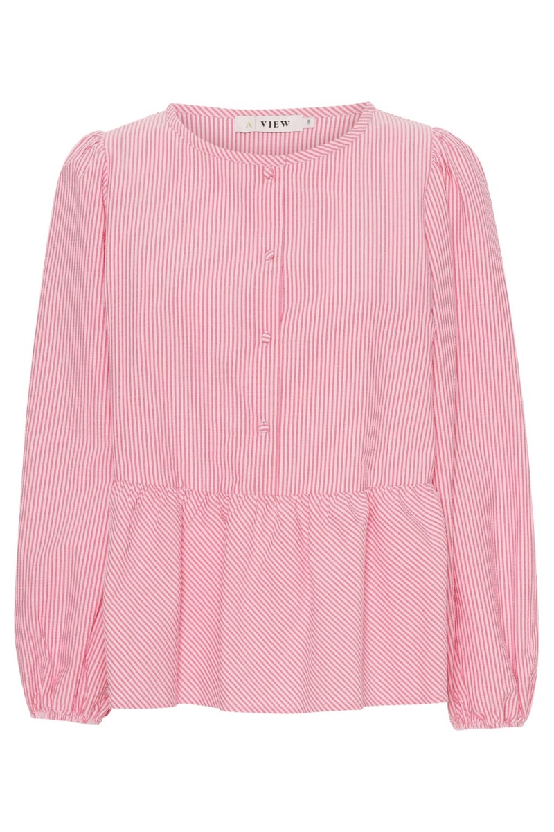 Sød bluse fra A-View i stribet mønster. Blusen har rund halsudskæring med stofbetrykket knapper og peplum i bunden. De lange ærmer afsluttes med elastikkant der giver et fint ballon-snit. Den er super sød at style med et par jeans eller sorte bukser.