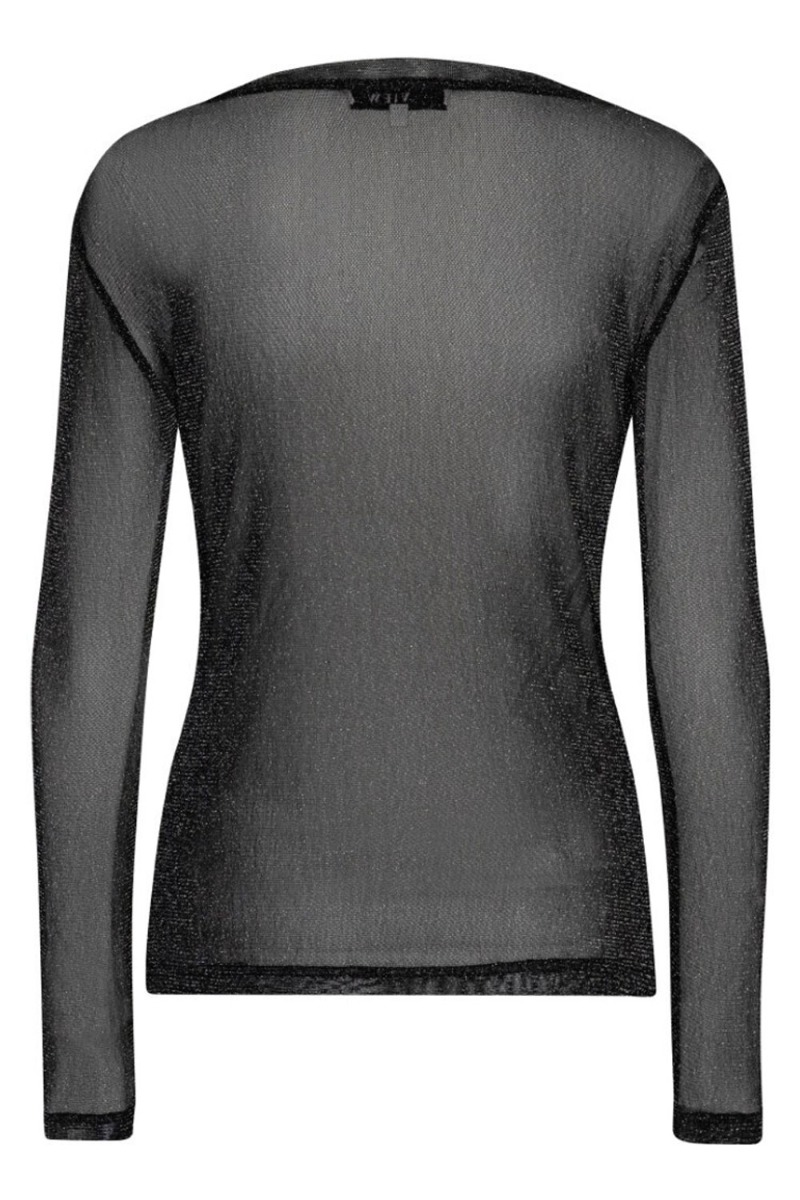 En fin bluse med glimmer effekt fra A-View i sort med slvfarvet glimmer tråd. Den er gennemsigtig derfor anbefaler vi at du bruger en bluse eller top under. Den er dejlig let i kvaliteten og kan nemt bruges sammen med en nederdel eller et par bukser. Den findes også i flere farver.