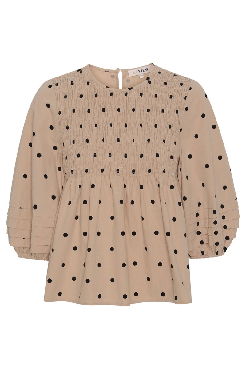 Beige bluse med sorte prikker fra A-View. Blusen er a-formet med smock ved brystet og rund halsudskæring der lukkes i nakken. Ærmerne er med 3/4 og har de finesste flæsedetaljer og elastik i kanten. Style den til jeans og bukser.