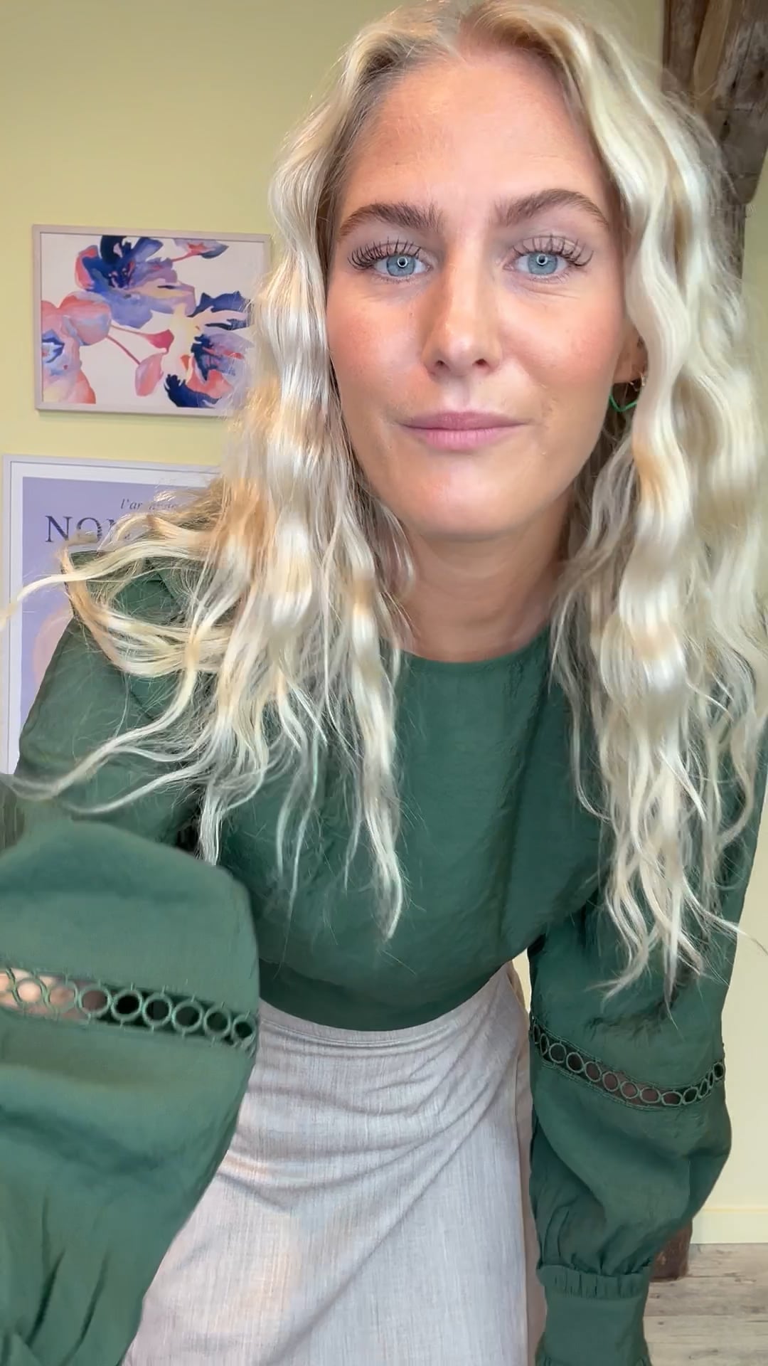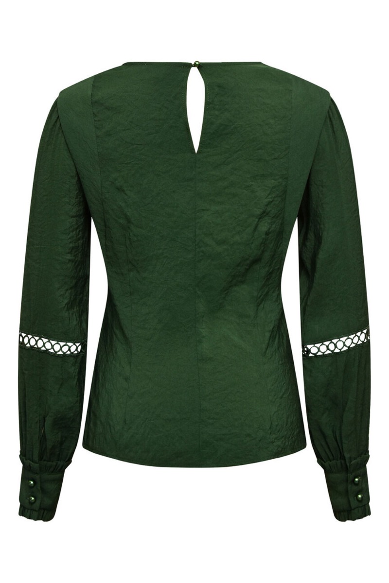 Nu begynder efterårsfarverne at lande! Dette er em bluse fra A-View i en smuk army grøn farve. Blusen har en fin blonde detalje på ærmerne og afsluttes med en lille flæse der lukkes med perler. Blusen har en sej flæse ved begge skuldre, men flæser rynker ikke, så den giver lige lidt kant til stylen. Den findes også i sand.