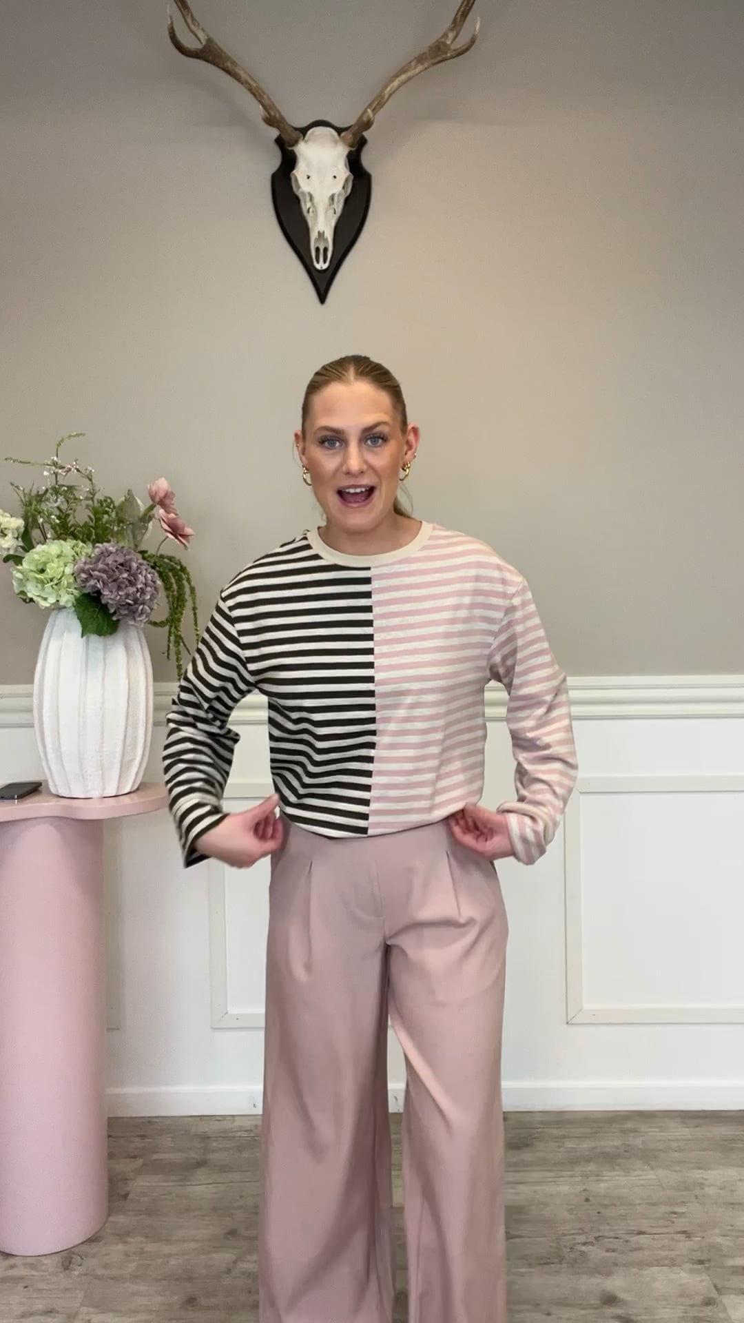 En moderne og legende langærmet bluse med et unikt miks af striber, der giver et iøjnefaldende, grafisk udtryk. Designet kombinerer bløde rosa nuancer med klassiske mørke striber, hvilket skaber en spændende kontrast og et casual, men stilfuldt look. Den har en afslappet pasform med rund hals og lange ærmer, som gør den behagelig at have på hele dagen. Perfekt til både hverdagsbrug og afslappede outfits – style den med jeans, habitbukser eller nederdel for et personligt og moderne udtryk.