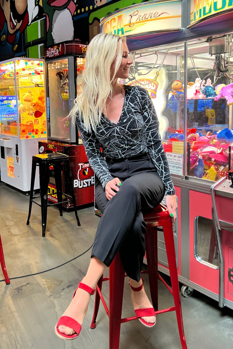 Vi må ikke glemme de smukke bodystocking som kan redde en i enhver tøjkrise. Denne bodystocking fra A-View er tætsiddende med stretch med det fineste grafiske sølv mønster med glimmereffekt. Bodyen har v-udskæring og lange ærmer der gør den anvendelig alene eller under dine blazere.