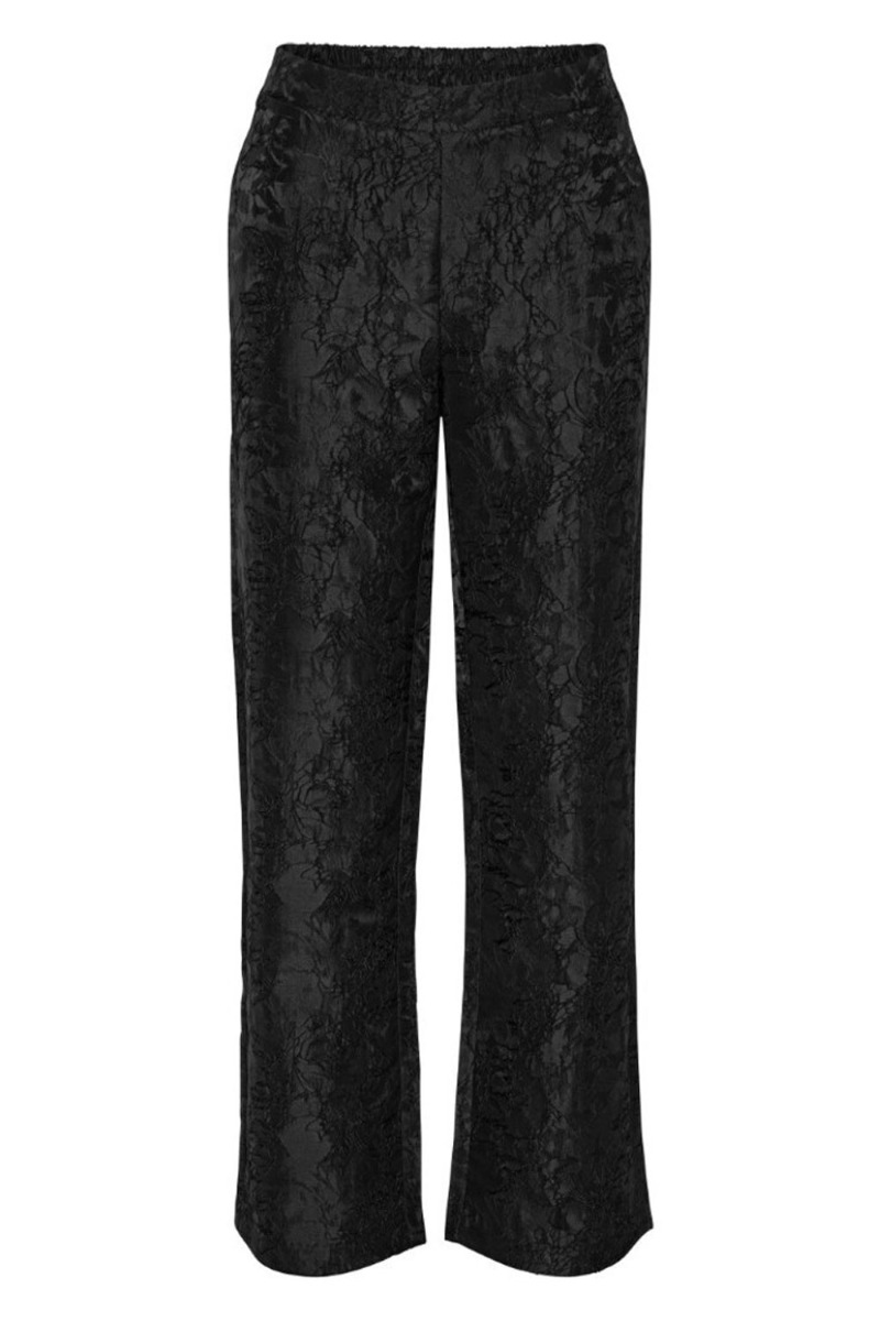Et par bukser fra A-View i sort med struktur i stoffet. Stoffet er mønstret med blomster og er fast i kvaliteten. Derudover er der elastik i taljen men kun bagpå så den er glat i taljen foran. Der er skrålommer i begge sider og vide i benene.