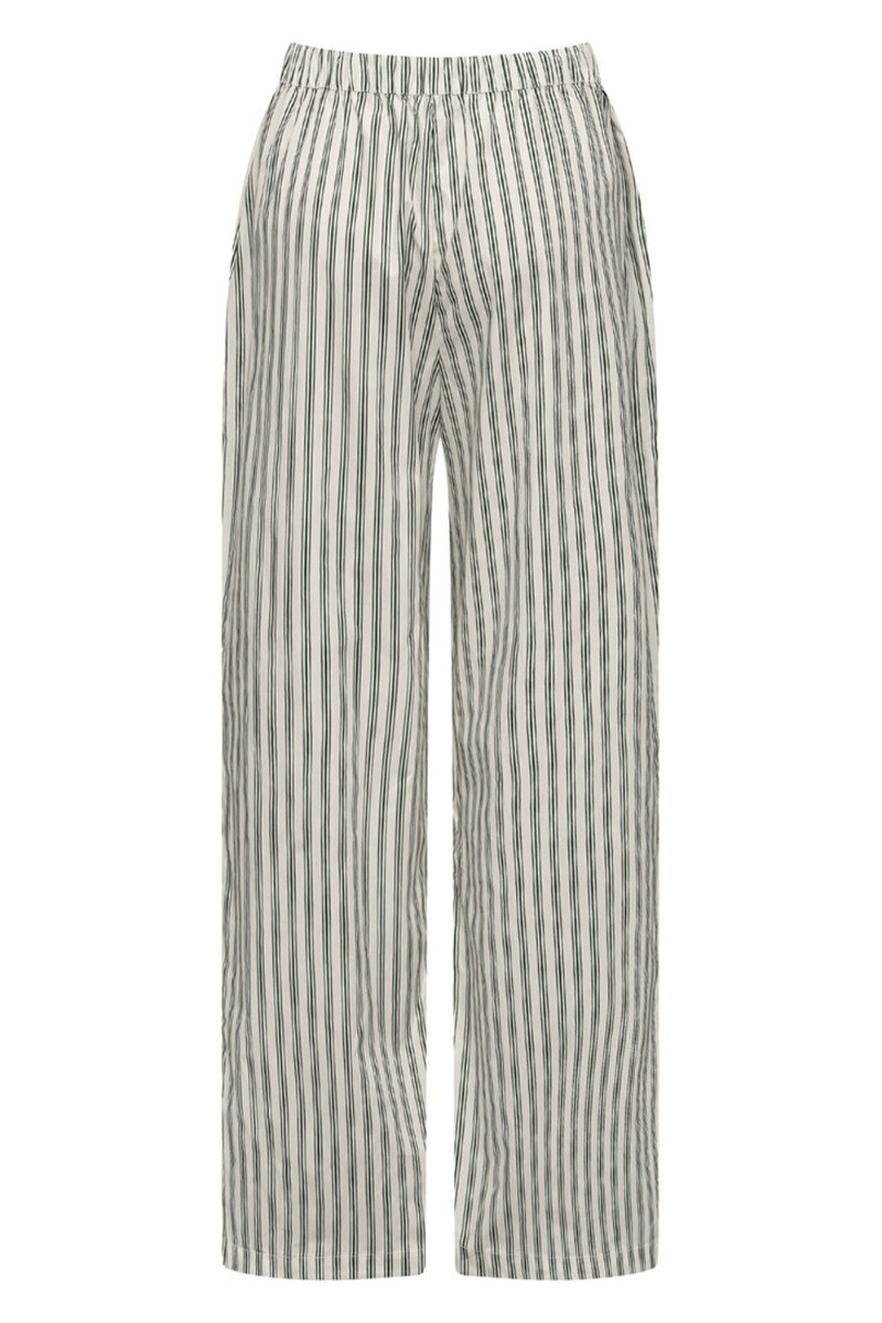 Dejlige bukser fra A-View med striber i hvid og den flotteste mørke flaskegrønne farve. Bukserne er løse med elastik i taljen og bindebånd foran, hvilket gør dem ekstra behagelige at have på. Style dem som sæt med den matchende skjorte.