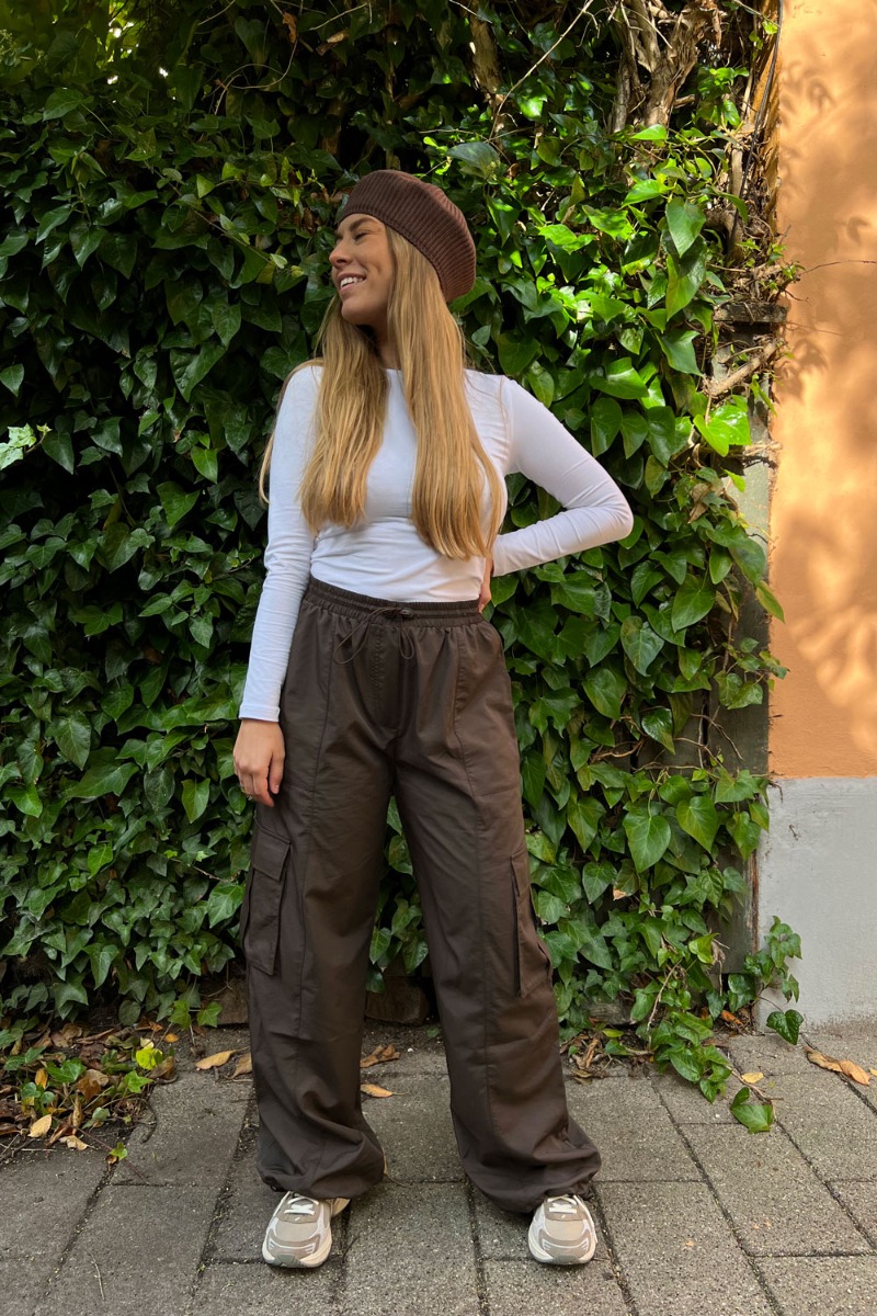 Sejeste mørkebrune cargobukser fra A-View! Cargo pants er årets helt store trend, så vi kan ikke vente med at disse lander fra A-View. Bukserne har et løstsiddende fit med masser af baggy og volume i benene. De har to lommer på begge sider af buksebenene og elastik ved anklen. Ved taljen har de elastikkant med elastiksnøre.