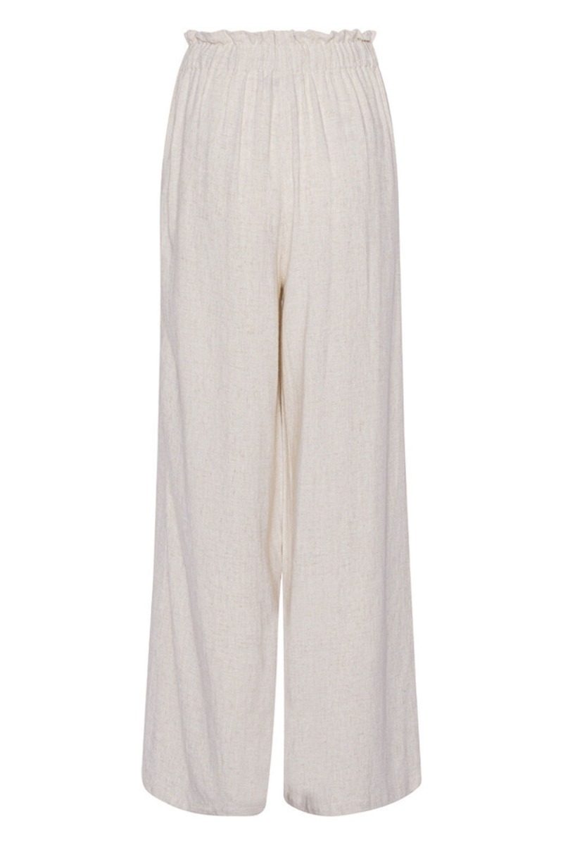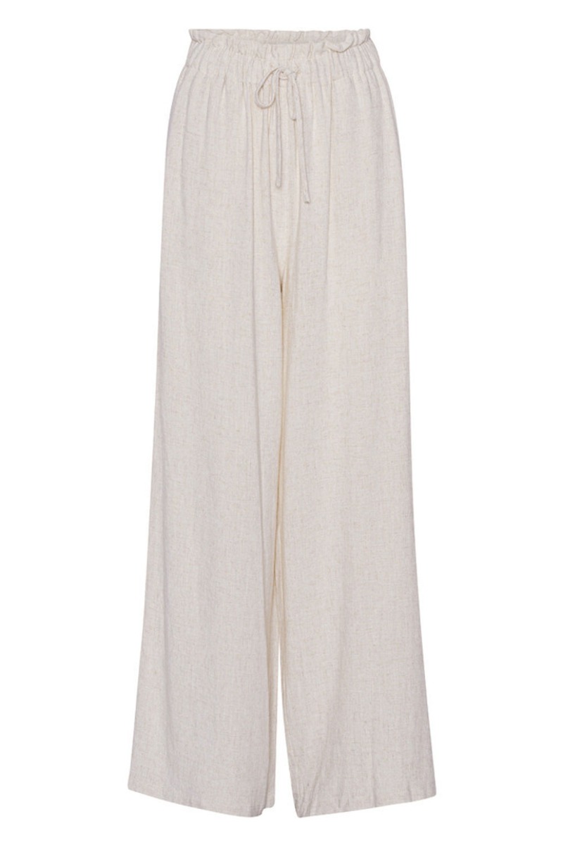 Skønne hørbukser i beige fra A-view i den skønneste kvalitet. Bukserne er med lidt ekstra bredde forneden, som giver et let udtryk. En stor tendens som vi kommer til at se meget mere af. De har en bred elastikkant med snøredetalje foran og sidelommer. Style bukserne til en skøn sommertop, en let blazer over og et par af vores skønne Havaianas klipklapper - så er du sommerklar!