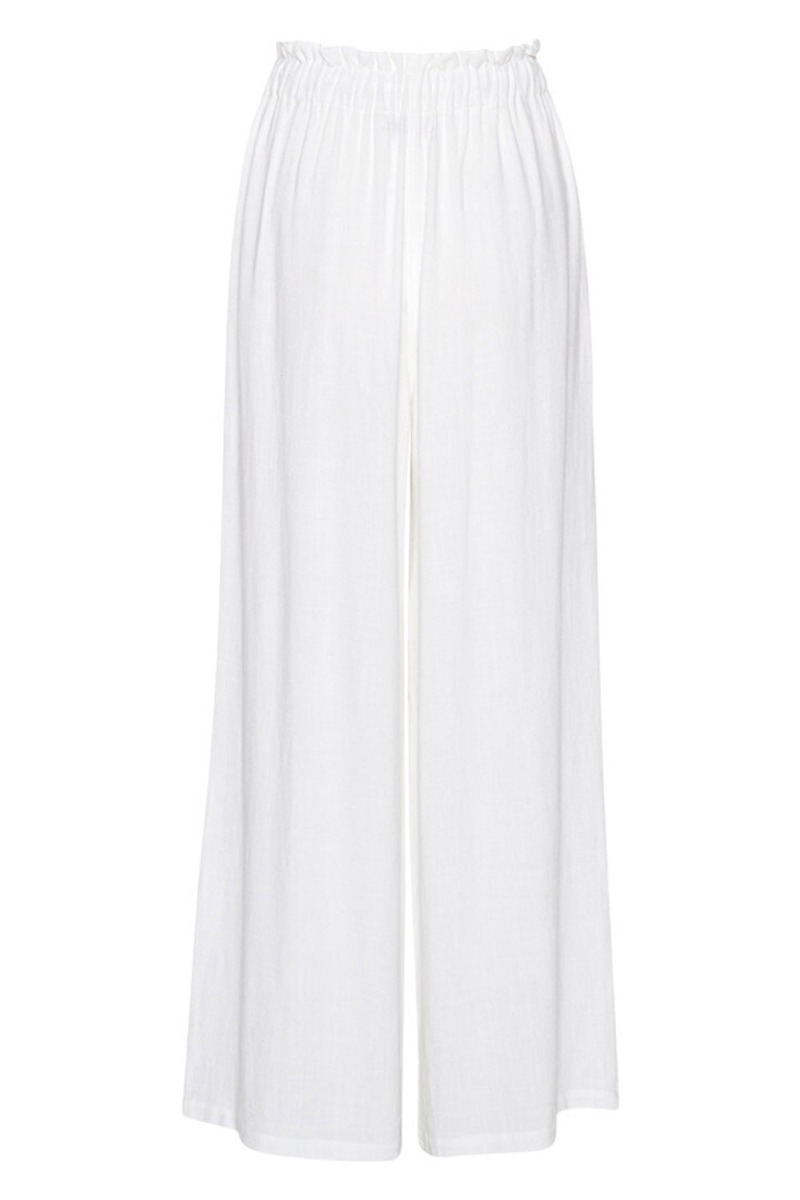 Lange løse bukser fra A-View i en dejlig luftig hørkvalitet. Bukserne er hvide med en bred elastikkant i livet der bindes med snøre foran. De har en lille sød flæsedetalje i kanten og er ikke foret indvendigt. Style til de varme sommerdage med en sød top til.