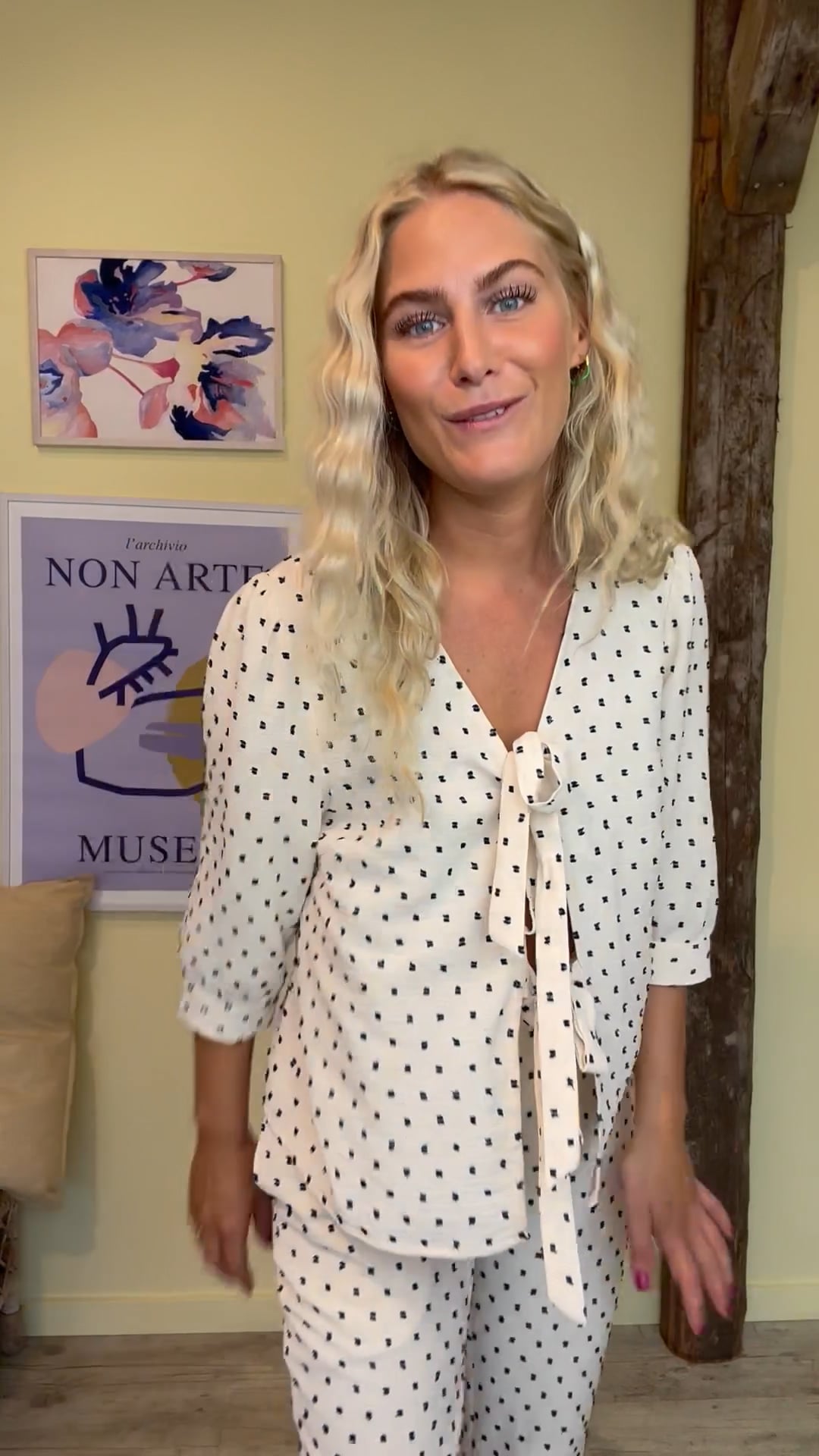 Super fine A-View bukser med løse ben og elastik i livet, som gør dem behagelige at have på. Bukserne er i den smukkeste lyse beige farve med små sorte prikker og har en lille flæsekant.