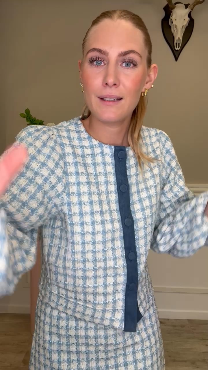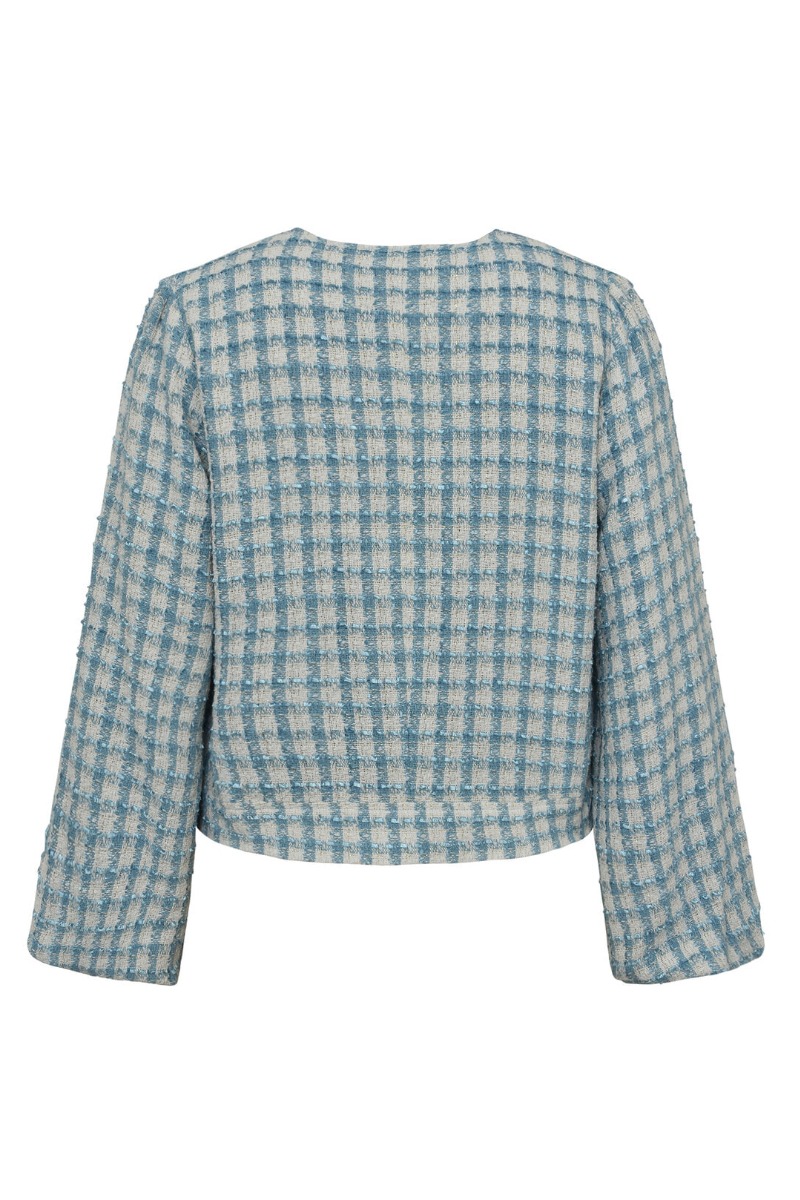 En super fin jakke fra A-View er landet i et dejligt materiale. Denne jakke er kort, har pufærmer og de flotteste blå nuancer. Jakken kan sagtens bruges alene til et par jeans eller en nederdel, men den er også super fin til den matchende nederdel fra samme mærke.