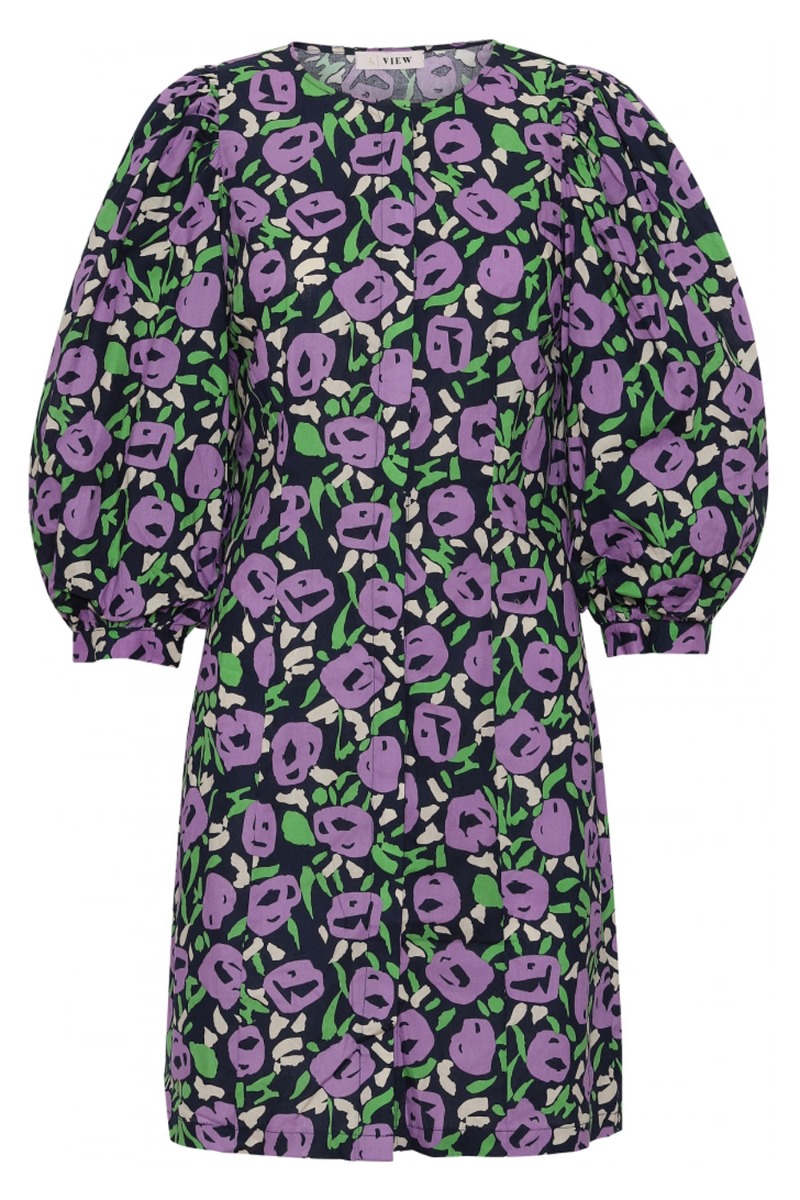 En smuk figurformet kjole fra A-View med trekvartærmer og pufeffekt. Kjolen har rund halsudskæring der lukkes med skjulte knapper foran. Bundfarven er mørk med et fint blomstermønster i lilla og grønne nuancer der stråler til efteråret.