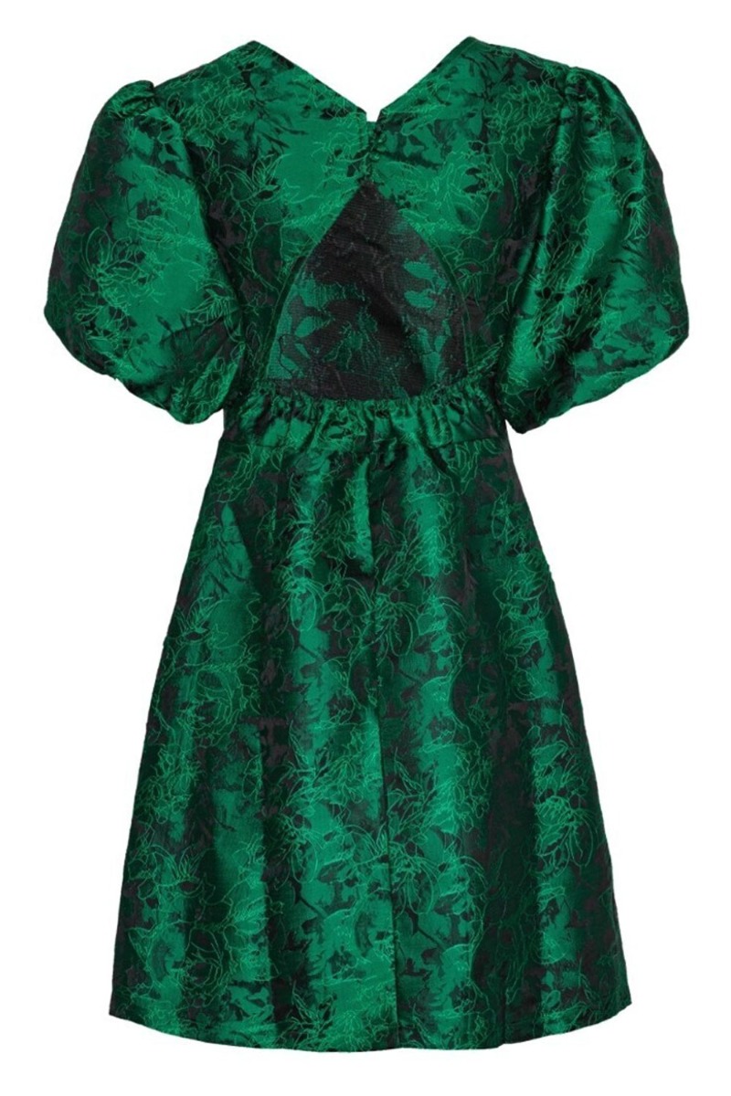 En smuk kjole i en endnu smukkere grøn farve er kommet fra A-View til dette efterår. Der er struktur i stoffet som danner et blomsterprint. Derudover er der puf ærmerne og knap lukning i nakken. Den har også en fin huldetalje i bagpå, som slutter lige ved taljen. Derfor har den også elastik bagpå så den ikke gaber ved bevægelse. Brug den til et par finde stiletter.