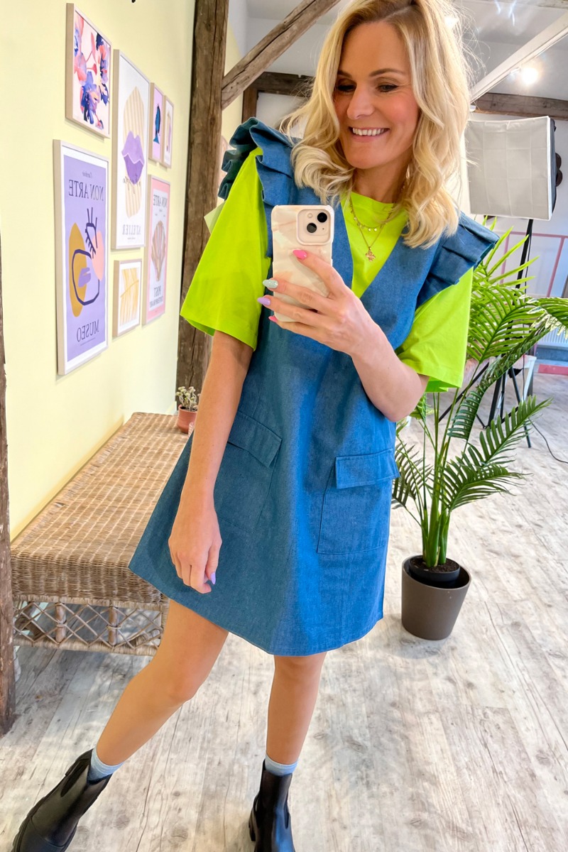 WAAAUV PIGER!! Se lige denne smukke A-View spencerkjole. Kjolen har flæser ved skuldrende og halsudskæringen går ned i et dybt V. Der er to lommedetaljer foran. Den er super cool at style til t-shirts og bluser.